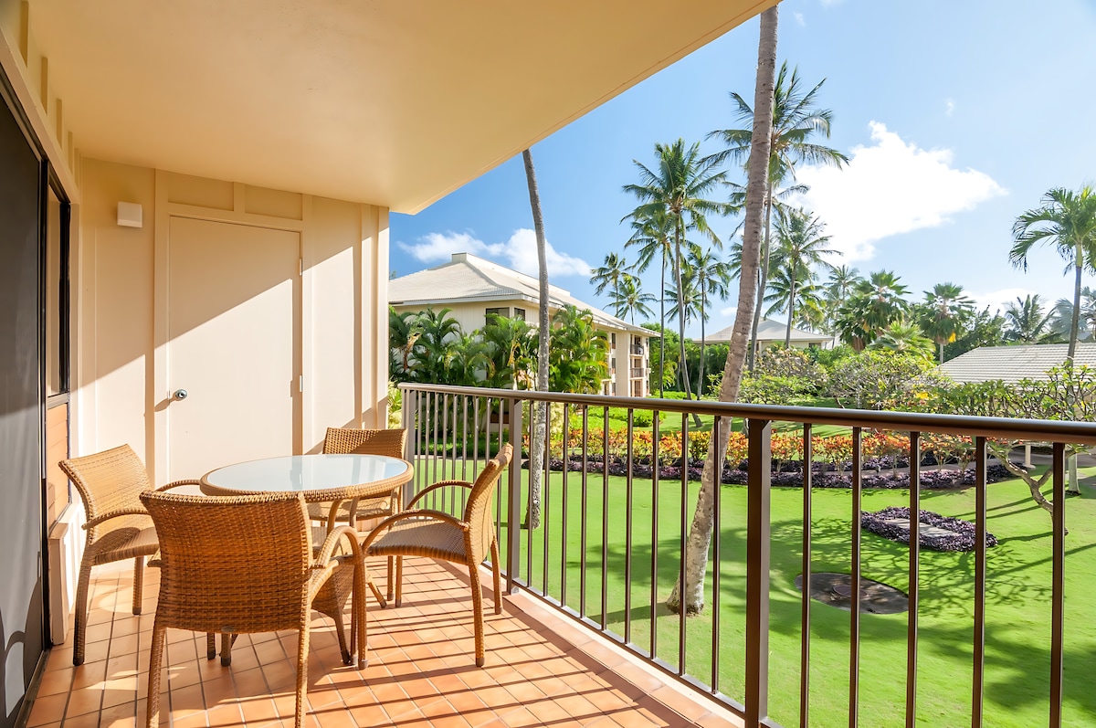Este apartamento en el centro vacacional de playa de la planta baja es la escapada tropical perfecta para unas vacaciones inolvidables. Tómate una bebida fría, dirígete al lanai privado y disfruta de los exuberantes jardines hawaianos con aves tropicales y el balanceo rítmico de las olas del Pacífico. Tu lanai privado está amueblado con un juego de comedor para disfrutar al aire libre. En solo unos pasos, llegarás a la orilla para sumergir los dedos de los pies en las suaves arenas del océano turquesa. Además, es posible que veas vida marina como tortugas o leones marinos en acción.