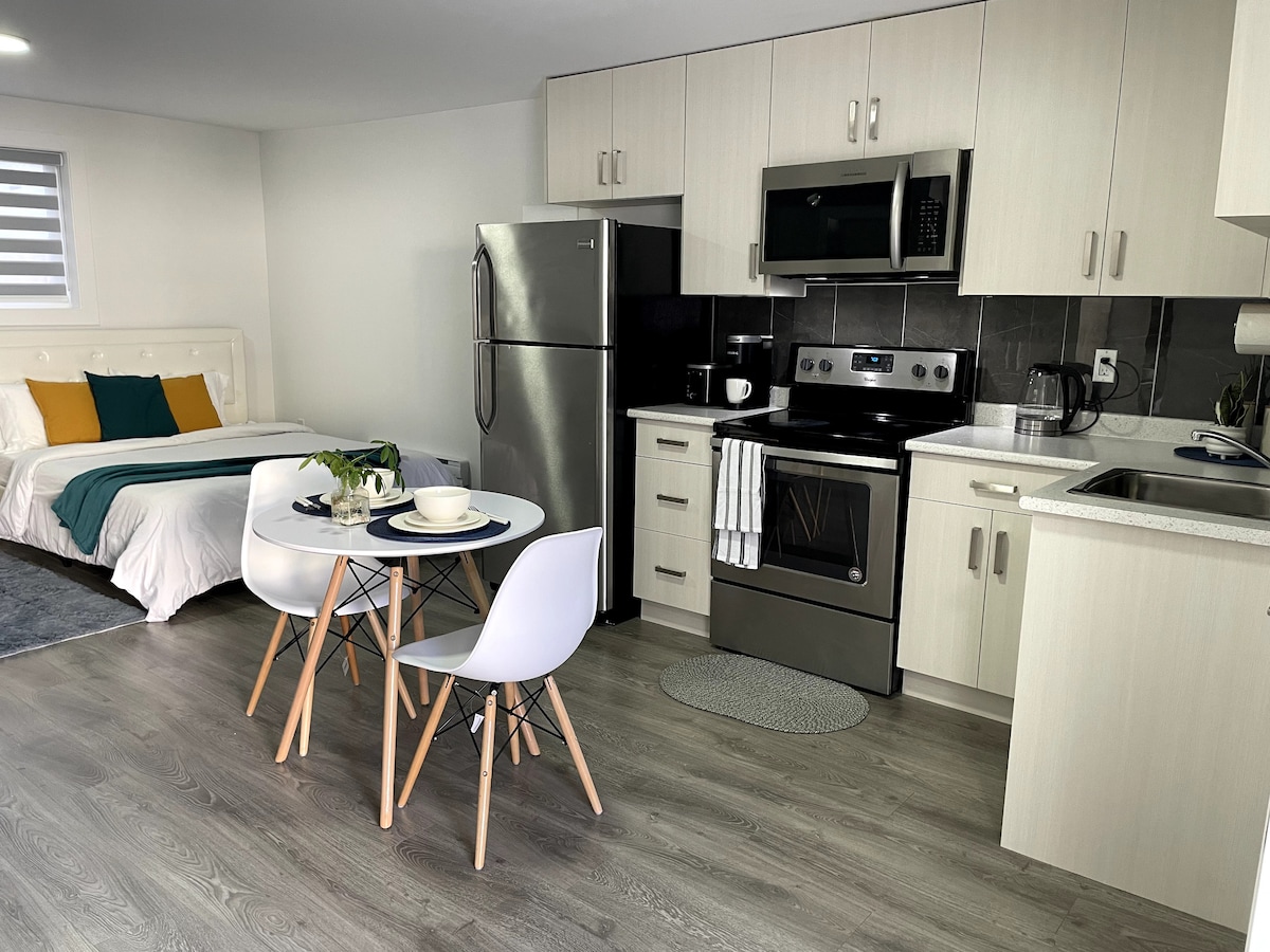 Suite de invitados moderna y privada perfecta para 2-3 personas que buscan alojarse en una ubicación céntrica y accesible. ¡Este espacio recientemente renovado cuenta con electrodomésticos nuevos y una larga lista de comodidades que incluyen una cocina completa, lavadora + secadora en la suite, estacionamiento gratuito, carga para vehículos eléctricos y más! Disfruta de la facilidad de acceso con tu propia entrada privada a nivel del suelo, desde un porche cubierto para autos donde puedes estacionar convenientemente justo en la puerta.