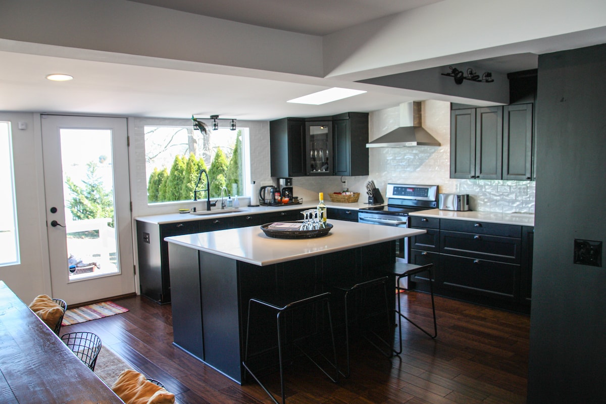 Una botella de vino te da la bienvenida a este apartamento privado diseñado por un arquitecto sobre un garaje independiente de nueva construcción. Disfruta de este acogedor espacio con todas las comodidades de un hogar. Estamos situados en un terreno de un acre en un barrio agradable y transitable. El apartamento es un espacio precioso con muebles modernos, suelos de madera, chimenea de gas y un televisor de pantalla plana de 60 pulgadas. Estamos ubicados a 3 millas del centro histórico de Annapolis y de la Academia Naval. Estamos a 1,5 millas del estadio de la Academia Naval.