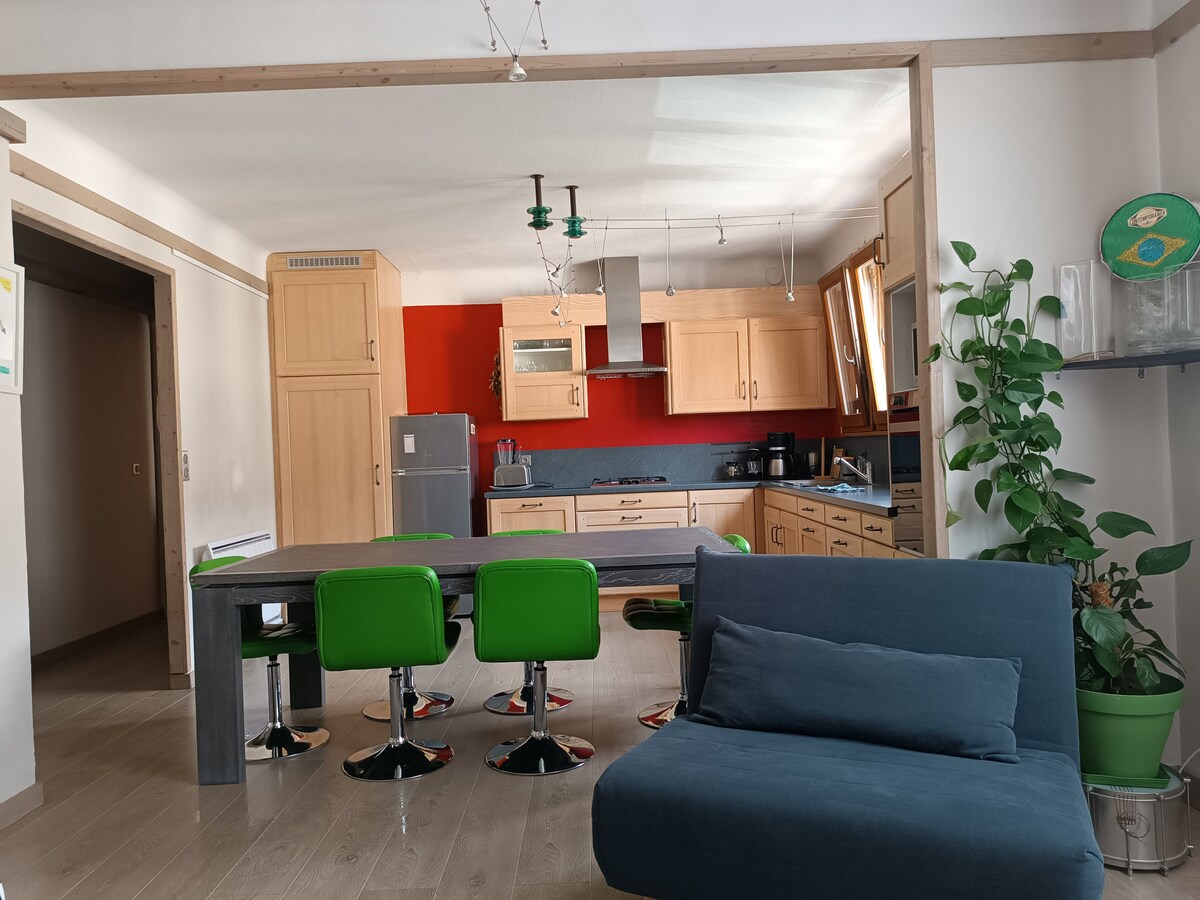 Cerca del centro de Annecy y su lago, en casa adosada, en el primer piso, apartamento de 84 m2 con cocina equipada, ducha a ras de suelo, sala de estar doble con chimenea, galería, dos dormitorios. Posibilidad de 2 camas supletorias (camas adicionales). Jardín grande. Aparcamiento gratuito en la calle. Apartamento con fibra Bicicletas disponibles.