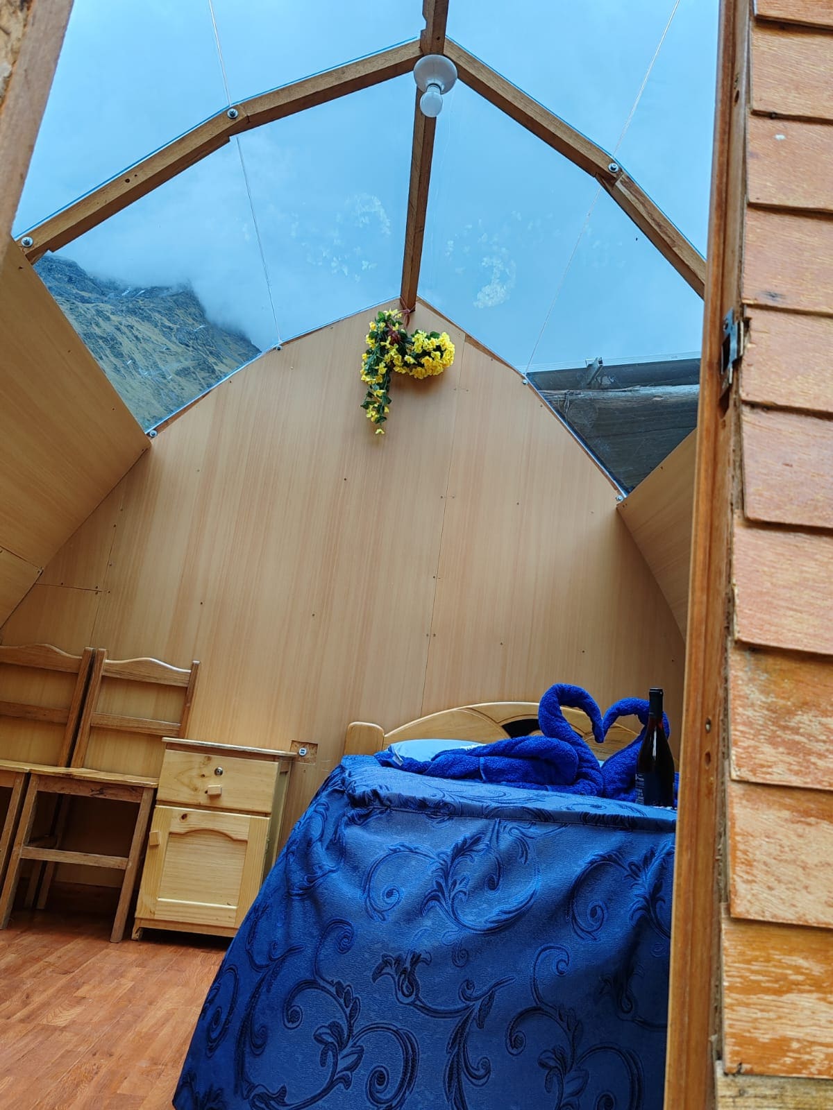 El alojamiento es muy bello, Domos a la medida con baño privado frente a la laguna Huaypo, las camas son muy cómodas y cuenta con todo lo necesario para una estadía placentera. Contamos con Calefacción.