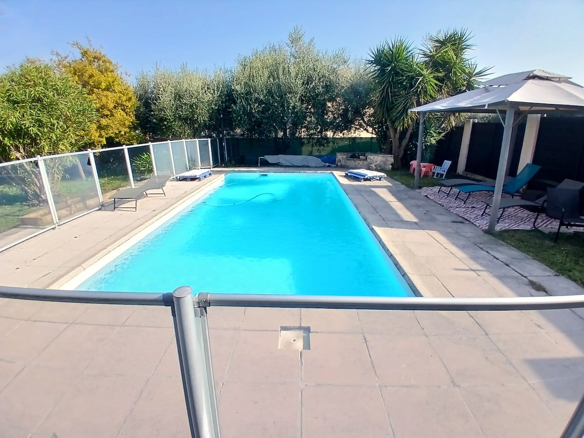 3 habitaciones en la planta baja de una villa con una gran piscina reformada en una zona tranquila idealmente situada cerca de los centros comerciales, a 3 km del mar, cerca de las vías de acceso (aeropuerto, estación de tren, autobús, autopista) y a 400 metros del pueblo y el río del lobo de Villeneuve Loubet. Capacidad para 4 viajeros ⁃ Una cama doble de 160 cm x 190 cm ⁃ 2 camas 90x190 - gran sofá de esquina - cocina nueva equipada ⁃ lavavajillas ⁃ Lavadora ⁃ Cafetera Nespresso -Wifi fibra y tomas RJ45