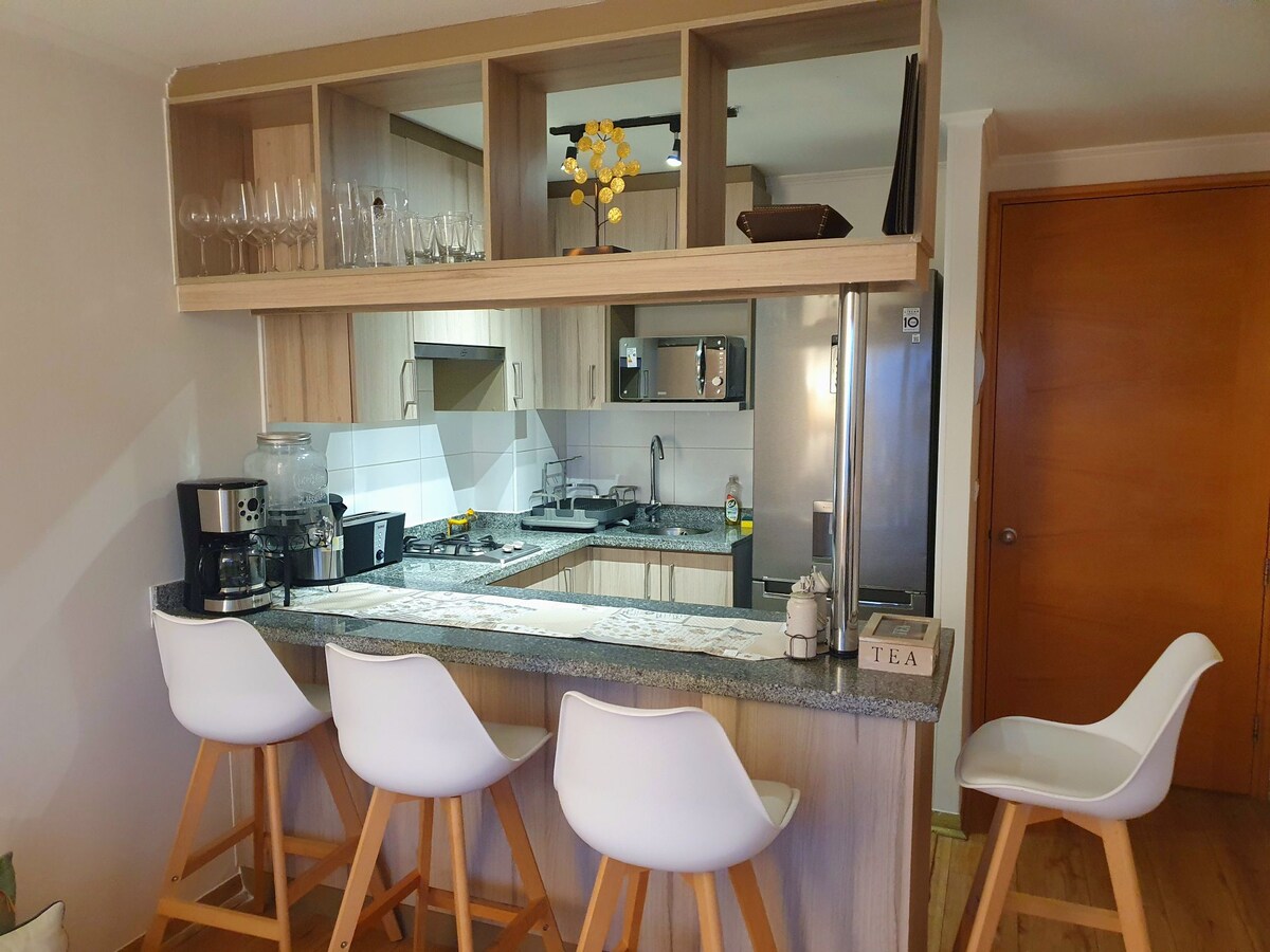 Hermoso departamento que cuenta con 1dormitorios en suite y tv en dormittorio, muy acogedor hermosamente decorado y full equipado para una estadía placentera, con una vista insuperable al mar, ubicado en el centro de la ciudad con muy buena conectividad locomoción a la puerta, supermercado cerca, centro comercial, con estacionamiento privado