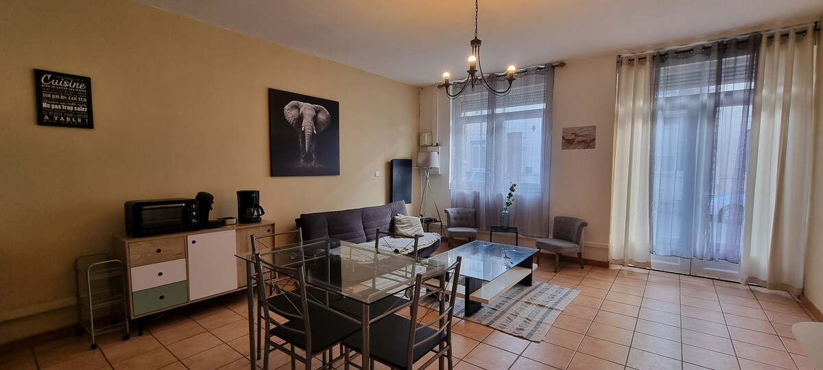 - Apartamento tranquilo, moderno y de diseño situado a 2 minutos del centro de la ciudad y de las tiendas, a 10 minutos a pie de la estación de tren de Cambrai. - Completamente renovado con todas las comodidades y wifi. - Cocina abierta totalmente equipada con nevera americana, lavavajillas - Cuarto de baño con ducha y bañera. - Un dormitorio equipado con una cama king size, armario y TV - Un lavadero con lavadora - Un aseo - Un sofá cama - ¡Se proporcionan sábanas, toallas y guantes de baño! - Una cafetera Senseo