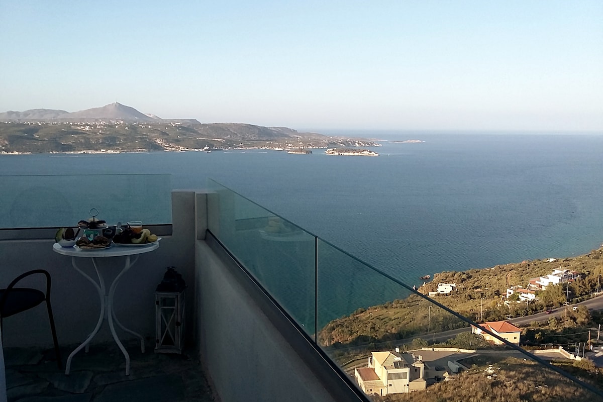 Este acogedor departamento está situado en un acantilado con un espectacular telón de fondo de una vista panorámica ininterrumpida al mar y vistas a la montaña frente al puerto de Souda. Totalmente renovado (2017) que consta de una habitación con cama tamaño queen, una sala de estar de planta abierta inundada con luz natural brillante conectada a un balcón privado en la esquina desde el que se pueden admirar las magníficas puestas de sol de La Canea. A poca distancia a pie de 3 tabernas tradicionales, cafetería, un minimercado. Este es el lugar ideal para relajarse y explorar la isla.