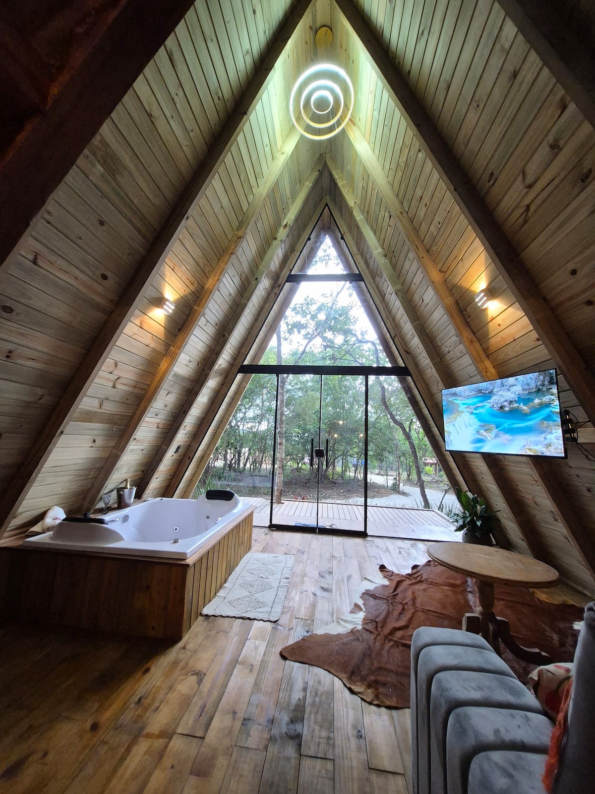 Cabana da Floresta, donde el atardecer se encuentra con el lago. Con una terraza exclusiva frente al lago, es el lugar ideal para admirar el atardecer. Equipado con dos bañeras de inmersión, cocina completa, sala de estar con sofá cama y un dormitorio separado con una ventana que da al bosque, ofrece comodidad, privacidad y una experiencia inolvidable en la naturaleza. ❌ No se permiten eventos. Las ✔️ reglas se detallan en la información específica en la pestaña “Normas de la casa”, léelas atentamente.