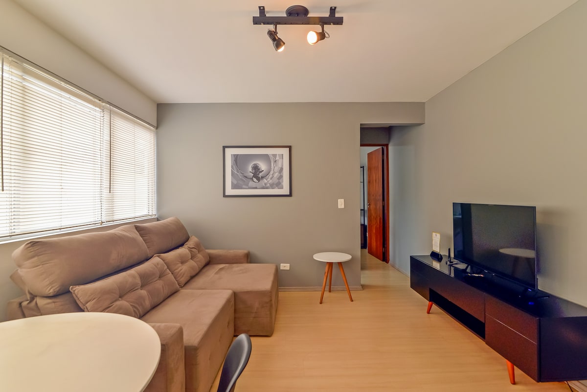 Precioso apartamento situado en pleno centro de la ciudad. Cerca del bohemio barrio de Batel, esta ubicación cuenta con un montón de tiendas y centros comerciales, como Shopping Crystal y Shopping Pátio Batel, Rua 24 horas. Ideal para dos personas, cuenta con salón comedor, un dormitorio, un baño completo y una cocina totalmente equipada. El espacio también cuenta con: wifi, TV inteligente, aire acondicionado frío y caliente, agua fría y caliente en la cocina y el baño. Proporcionamos ropa de cama y toallas de baño.