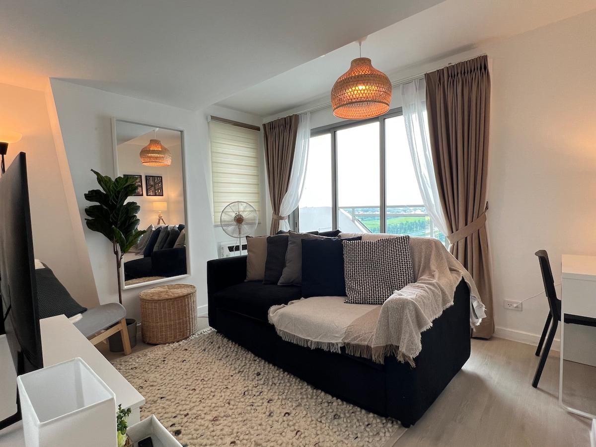 Este apartamento ofrece el ambiente más relajante y tranquilo que cualquiera busca, ya que está estratégicamente situado frente a la montaña y hermosos paisajes. Al estar en el balcón sentirás la brisa fresca y el aire fresco como si estuvieras lejos de la ciudad. La piscina con cabaña, el parque infantil y el jardín son accesibles y se pueden ver desde el balcón y la ventana del dormitorio.