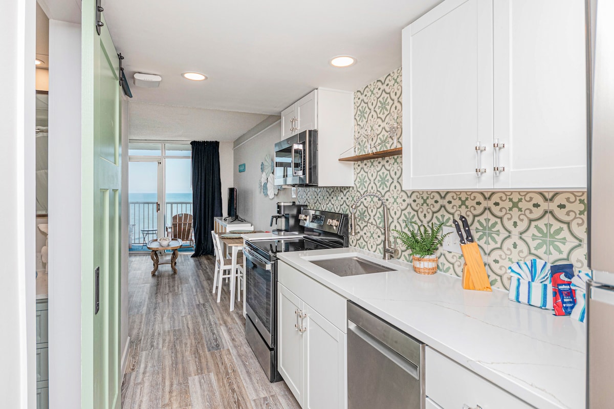 ¡Guau! Este lugar tiene de todo: frente al mar, balcón enorme, playas prístinas, múltiples piscinas, restaurantes, golf cercano ¡Bienvenido a OceanWave, tu mejor escapada frente al mar ubicada en el conocido edificio de North Hampton de Kingston Plantation! ¡Este NO es tu condominio promedio! Este condominio recientemente renovado (2025) ofrece comodidad de lujo, diseño refinado e impresionantes vistas panorámicas frente al mar. ¡Su amplio balcón con ventanas del piso al techo en todas las habitaciones te acerca a la playa!