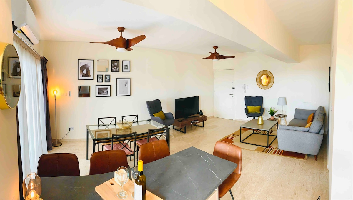 Apartamento contemporáneo de 2 dormitorios a 1,6 km del mar en Linopetra, Limassol. ¡Tienes una terraza privada en la azotea con jacuzzi! La azotea está equipada con parrilla, chimenea, lavabo, salón y comedor con vistas a la ciudad. Hay 2 dormitorios dobles, 2 baños, cocina moderna totalmente equipada con comedor, balcón cubierto, INCREÍBLE sofá con mecanismo de extensión. Disfruta de Nespresso, la Smart TV. Ten en cuenta que hay obras en curso al otro lado de la carretera, que pueden comenzar temprano debido al calor.