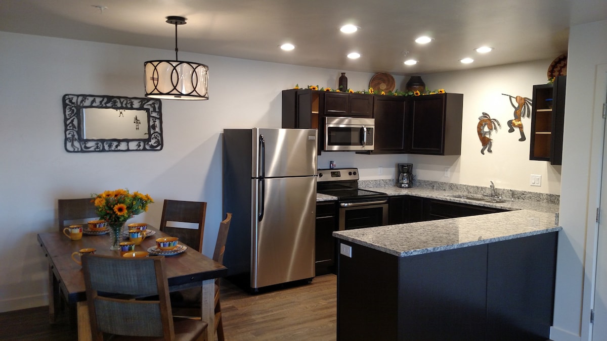 Este condominio accesible por la ADA en la planta baja se ubica en el centro de Moab. Cocina moderna totalmente equipada, dos dormitorios espaciosos, dos baños y patio privado con parrilla de gas Weber. Dormitorio principal tamaño king con baño privado. El segundo dormitorio con 2 camas individuales tiene acceso privado al baño del pasillo. La sala de estar abierta incluye un sofá cama tamaño queen y acceso privado al patio. Incluye dos espacios de estacionamiento designados.