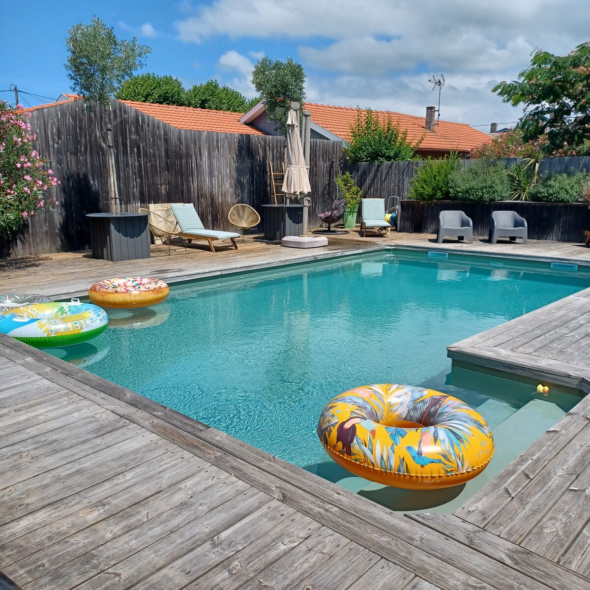 Casa de madera, reciente, tranquila, con una piscina climatizada del 1 de mayo al 30 de septiembre, con una persiana y una alarma, así como una hermosa terraza. Bienvenido a una casa tranquila y exótica, cuya ubicación es ideal para descubrir la piscina. Playa y puerto ostrícola a 15 min a pie. Patio luminoso, acondicionado en family room. Casa bien equipada (plancha, altavoces, fibra, aire acondicionado...). Ropa de cama nueva (camas queen size)