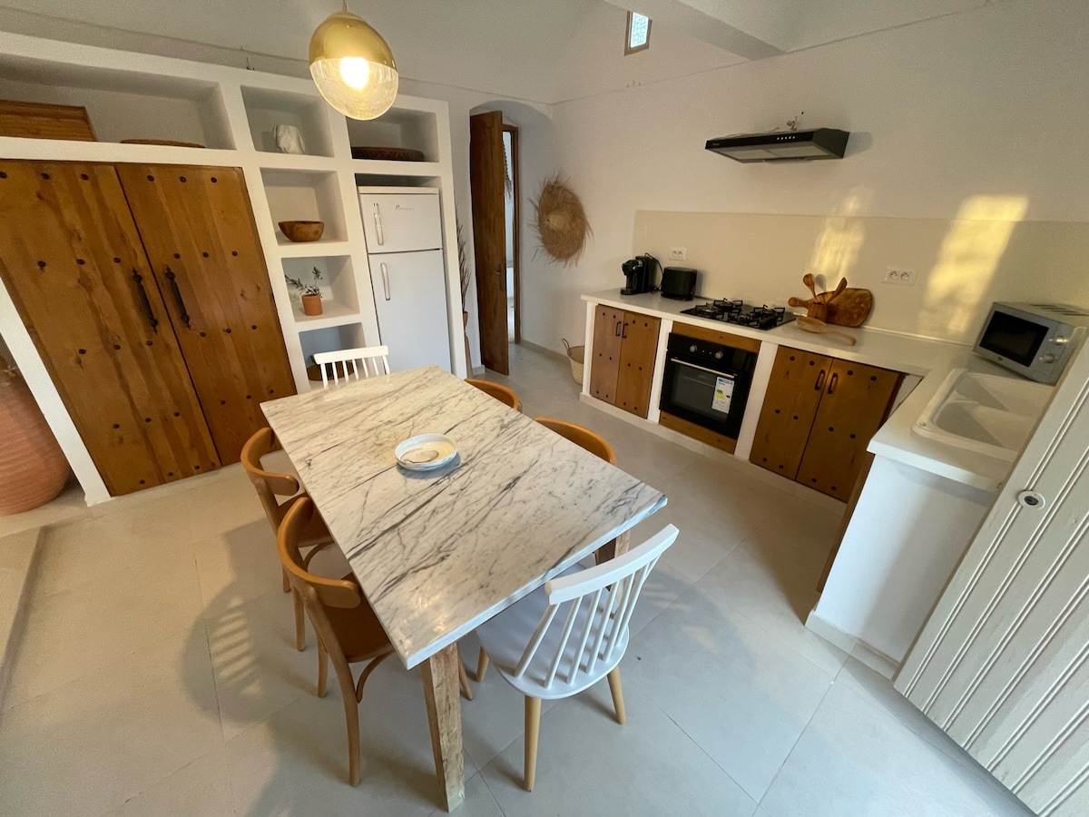 Este alojamiento tranquilo ofrece una estancia relajante para toda la familia. Encontrará 2 dormitorios, cada uno con su baño contiguo, un baño, una luminosa sala de estar-comedor, una cocina equipada, así como hermosas terrazas y un jardín privado para disfrutar del sol de Djerba con total tranquilidad. Perfecto para familias o amigos que deseen combinar el confort moderno y el ambiente tradicional de Djerba.
