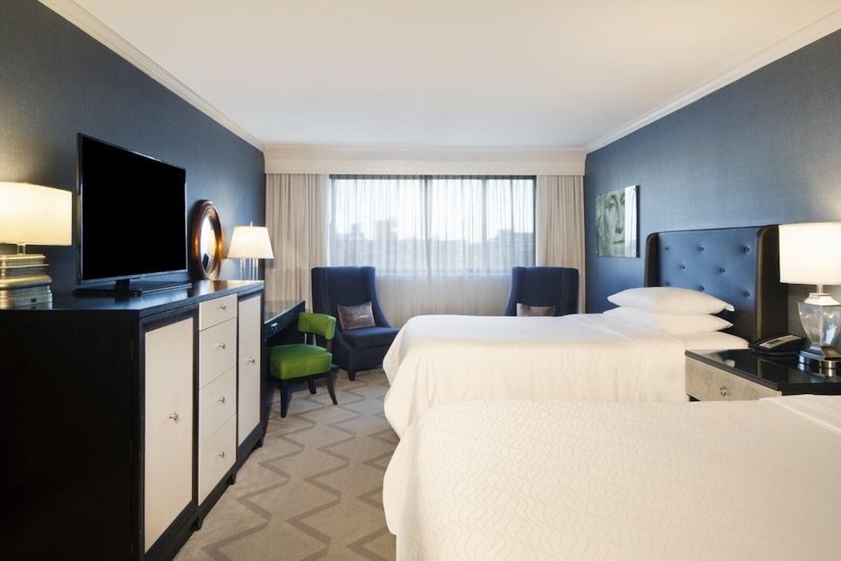 Estas espaciosas suites renovadas y mejoradas con una cama tamaño king y 1,5 baños ofrecen un amplio espacio habitable en los pisos superiores mejorados de este rascacielos urbano. Las salas de estar tienen muebles elegantes, mejorados y contemporáneos que incluyen un sofá, una silla cómoda y un comedor. Dos televisores de pantalla plana y cable digital premium con HBO.