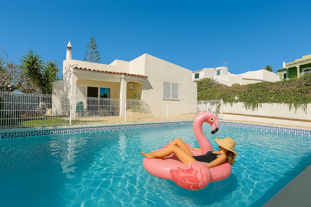 Understated elegance and exceptional attention to detail are the hallmarks of this chalet. Furnished in earthy tones and natural textures, this great 4 bedroom property is Albufeira's latest treasure offering everything you need for your holiday. The most beautiful beaches only 15 minutes away. There is an outdoor swimming pool onsite for your enjoyment! Staying here also allows you access to the private garden. As a self-catering chalet, you'll find everything you need for a perfect stay. The kitchen has a fridge, a hob, an oven, a kettle, a toaster, a freezer, dishwasher and a microwave. The chalet is a perfect place to relax and offers a television and internet access. This chalet has 4 bedrooms and can comfortably sleep 8. In the first bedroom, you will find a queen bed. In the next bedroom, there are 2 single beds. The third bedroom contains a double bed. The fourth bedroom contains 2 single beds. There are 3 bathrooms. The first bathroom has a toilet and sink and a walk-in shower. The second bathroom has a toilet and sink and a walk-in shower. The third bathroom is outside near the pool has a toilet, a sink and a walk-in shower Linen, towels, essential toiletries and an iron are all included to make your stay more enjoyable. Airport transfers, private taxi, ticketshop, concierge available upon request. Supermarket and shopping mall 7m away Beach 15m away House Rules: - Check-in time is 4pm and check-out is 10am. - Smoking is not allowed. - There are free parking on premises parking facilities available at the property. - A washing machine is included for your use. - Pets are not allowed at the property. - Safe deposit 400 Euros pay on arrival