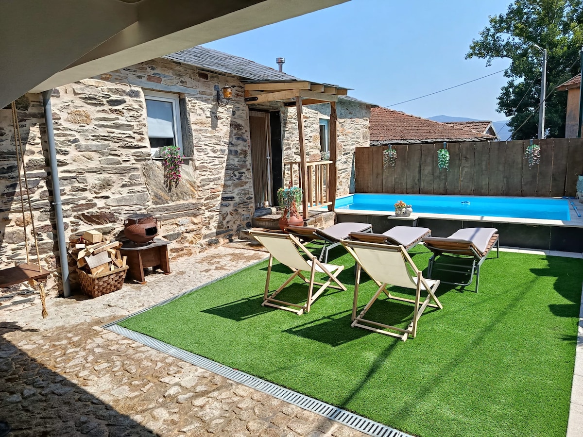 The house offers 2 bedrooms and 1 bathroom, living room with fireplace, and fully equipped kitchen where you can prepare your meals. Outside, enjoy a furnished outdoor dining area with a private swimming pool and a grassed area, with a beautiful view to Serra da Freita.