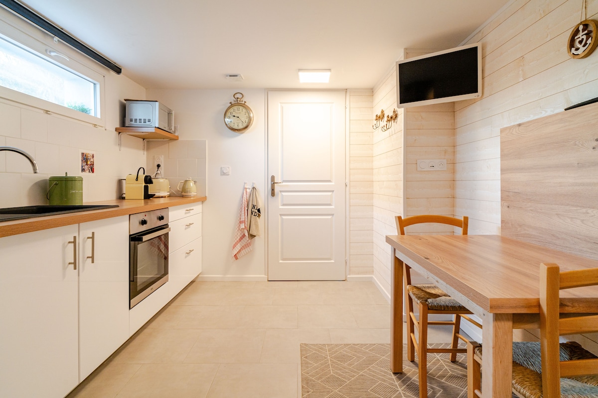 Su historia en la Historia. Venga a alojarse en el segundo piso de la mansión en un elegante apartamento de 65m2. Este apartamento goza de una vista despejada de la campiña de los alrededores, su decoración refinada invita a la calma y al descanso. La sala de estar ofrece un cómodo salón y una mesa de comedor, la cocina está equipada, el baño con ducha es amplio y agradable. Hay dos habitaciones, cada una equipada con una cama tamaño queen de calidad hotelera.
