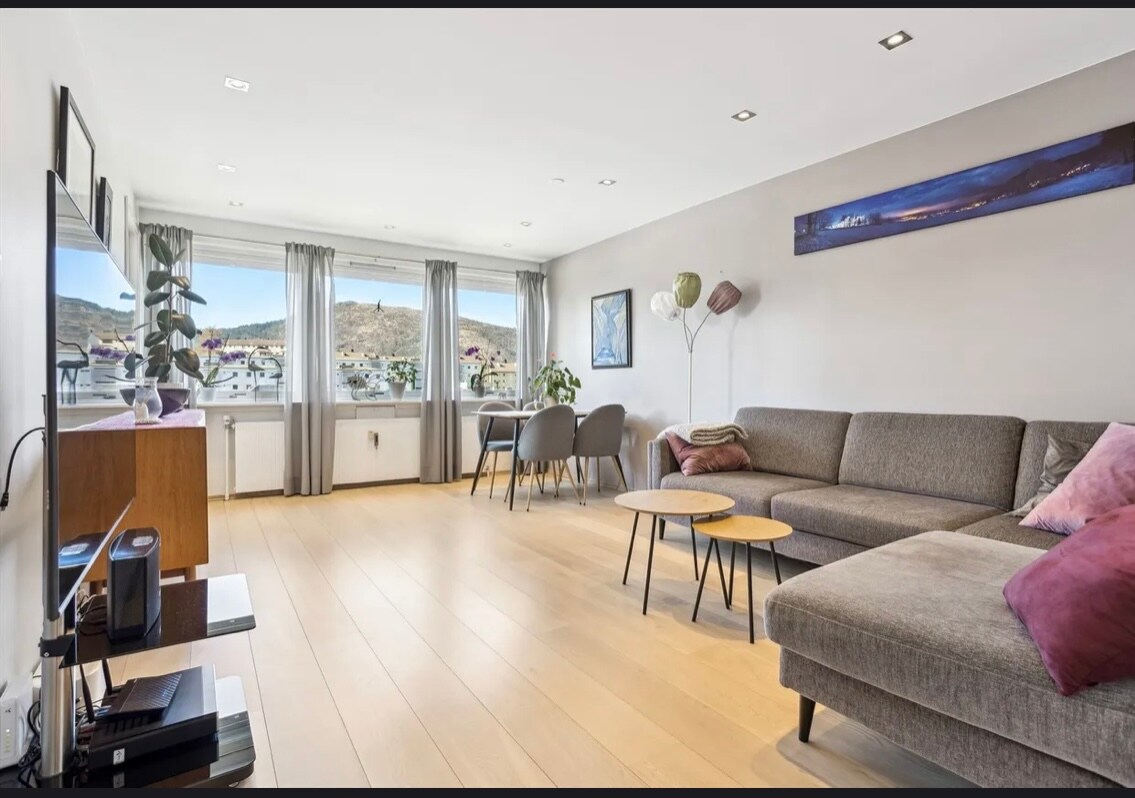 Encantador ático de alto nivel en el sexto piso. Bonitas vistas, terraza privada y gran terraza con vistas de 360 grados. Ascensor. Ubicación muy céntrica a poca distancia a pie de Bryggen, restaurantes, pub, parque, playa. Cerca inmediata de la estación de trenes. Tren ligero de Bergen con acceso directo desde el aeropuerto. Tienda de comestibles en el edificio vecino. A 50 metros del estacionamiento más cercano y a 300 metros del estacionamiento. ¡Buen plano de piso con 2 dormitorios y 2 baños! Lavadora y secadora de uso gratuito.