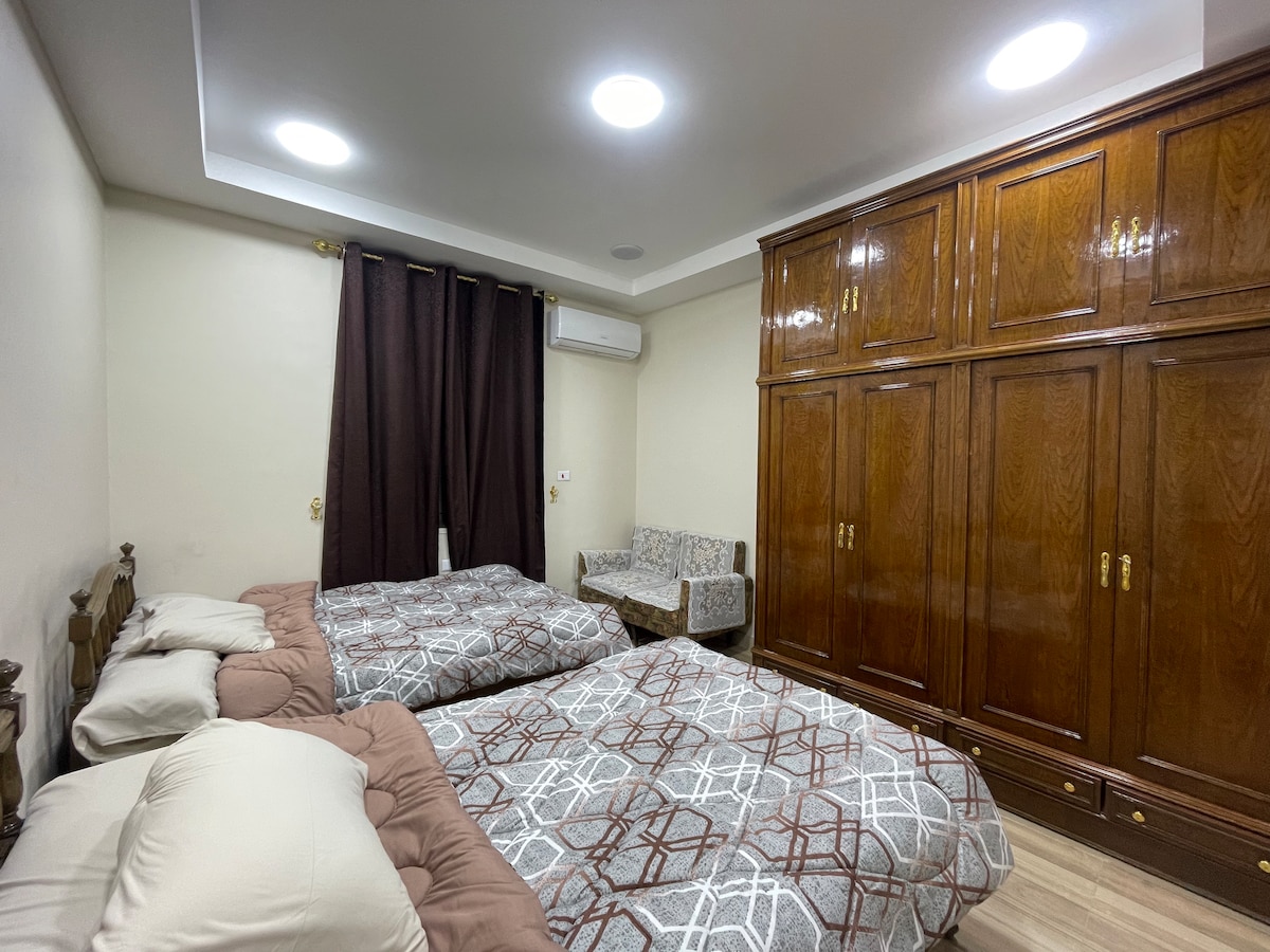 Apartamento entero en la zona más tranquila de la ciudad de Nasr, a 10 minutos en auto del aeropuerto de El Cairo. La casa tiene: -2 habitaciones con 3 camas y aire acondicionado, - Todos los electrodomésticos necesarios (wifi, microondas, horno, freidora de aire, caldera de agua, calentador, nevera, 3 aires acondicionados, lavadora, plancha, televisión y aspiradora) - Baño con bañera - Calentador portátil para clima frío. El edificio tiene ascensor, y se puede estacionar en la calle, hay un supermercado abajo, farmacia y un gimnasio muy cerca, está a 10 minutos a pie del metro.