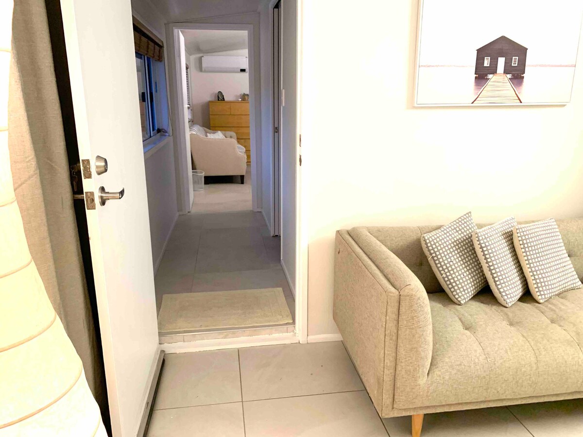 Situado en Southport. Cerca de tiendas y cafeterías de Chirn Park, a menos de 2 km del Broadwater. Gran vivienda familiar en una calle acogedora. Somos una familia inclusiva que recibe a huéspedes de todos los orígenes. Acceso independiente al piso para los huéspedes. No se puede acceder al apartamento desde la casa principal, por lo que la privacidad está asegurada. Cómoda cama tamaño king en el dormitorio y sofá cama tamaño queen en el salón/comedor. Cocina pequeña capaz de cocinar la mayoría de las comidas para una estancia autosostenible. El aire acondicionado en el dormitorio enfría/calienta todo el piso