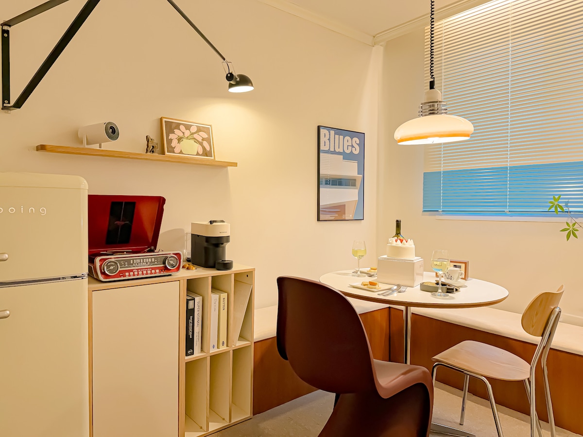 Una suite luminosa de un dormitorio con grandes ventanales y un escritorio espacioso, ideal para viajeros de trabajo o para aquellos que aman la luz natural. Este espacio relajante incluye un diseño de baño único, una cocina compacta con todos los elementos esenciales y un acogedor sofá cama para acomodar a un tercer huésped. Ubicado en un edificio patrimonial de 1965 con cálidos detalles de madera y detalles coreanos hechos a mano, el apartamento ofrece una estancia tranquila pero conectada en el corazón de Seúl, a solo unos pasos de Seosulla-gil y el palacio Changdeokgung.