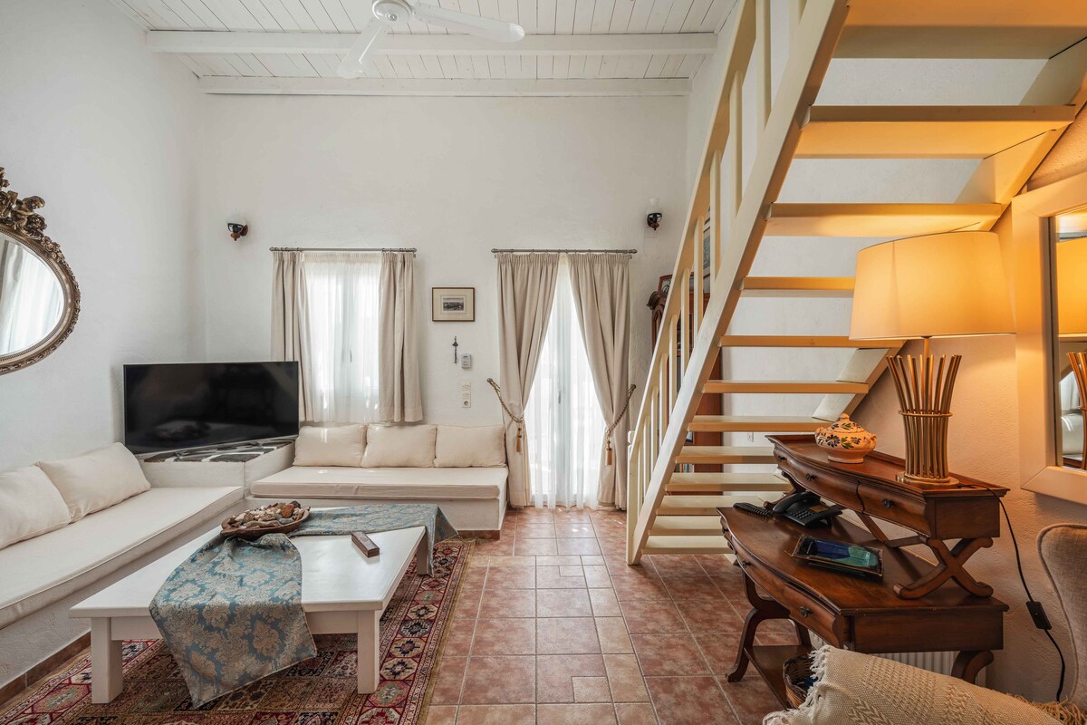 Descripción: Suites de una habitación con una tradicional plataforma elevada de madera para dormir (sofás) con una cama doble, dos camas individuales (se pueden convertir en una cama doble con un colchón), una sala de estar con sofá cama y escritorio, un comedor y una cocina totalmente equipada, un baño con ducha y un balcón privado con vistas despejadas de la bahía de Livadi, Chora y el castillo veneciano. Personas: 2-4 personas (2 personas en una cama de matrimonio en la plataforma elevada, 2 personas en 2 camas individuales)