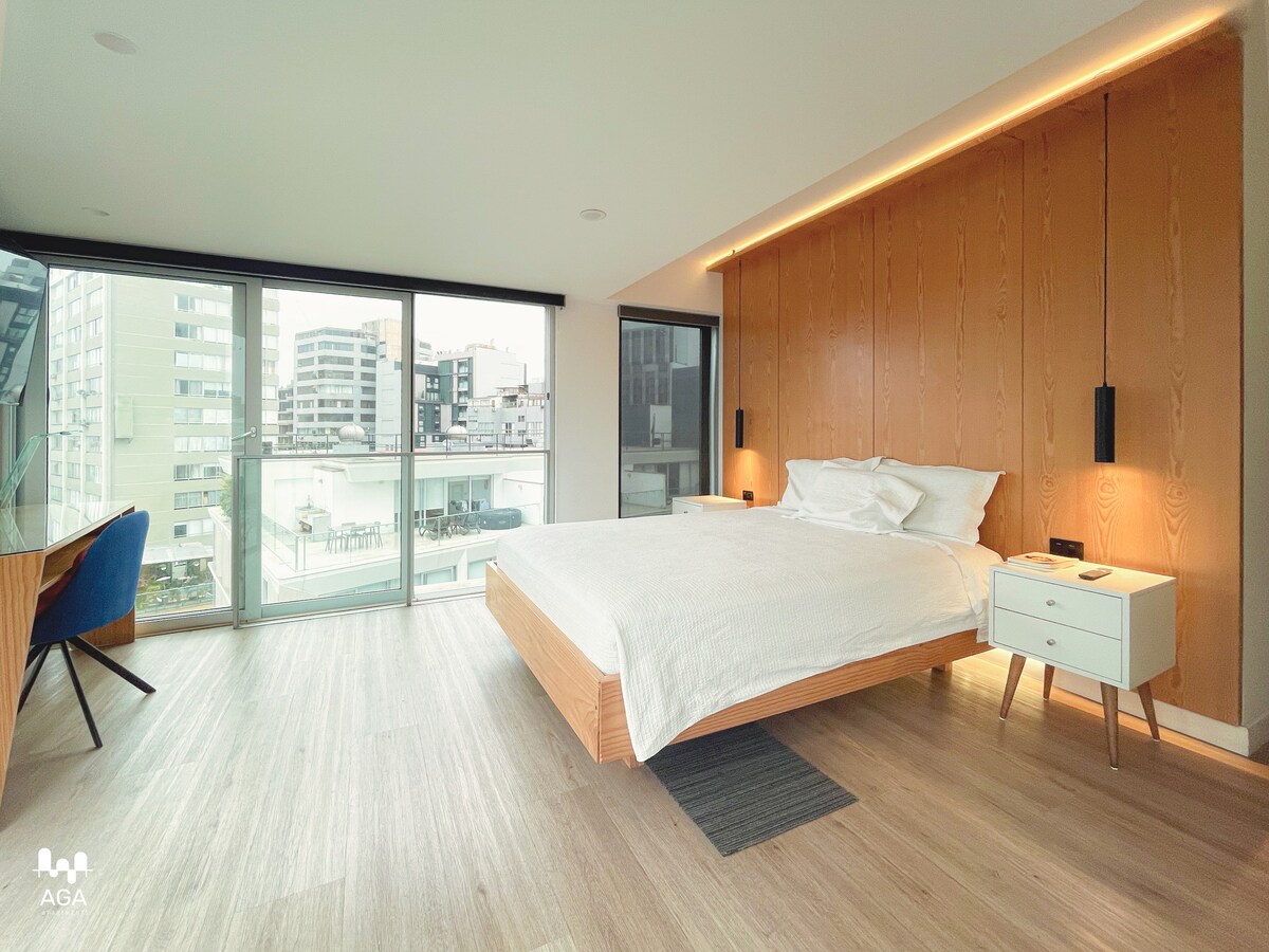 Despierta con vistas abiertas al skyline a solo media cuadra del Parque Kennedy, en el corazón de Miraflores. Este loft boutique, luminoso y silencioso, es ideal para estancias largas y trabajo remoto. Las mamparas de piso a techo ofrecen vistas a la Av. Diagonal, al jardín interior del edificio y al skyline de Miraflores. Acceso a piscina rooftop, gimnasio, coworking, estacionamiento privado, Wi-Fi rápido, self check-in y recepción 24/7, rodeado de cafés y restaurantes.