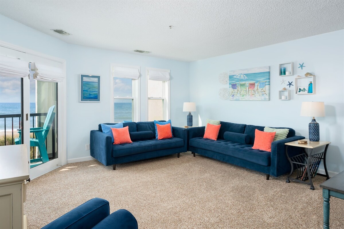 Nuestro Oceanfront Oasis en Indian Beach es un apartamento de lujo recién reformado con vistas al mar, ubicado en Colony by the Sea en Indian Beach. Disfruta de la privacidad de una unidad final, un cómodo balcón privado, mientras contemplas la belleza del océano Atlántico. Esta unidad está frente al mar en el primer piso, a pocos pasos de la playa. El oasis ofrece un apartamento totalmente equipado que incluye una cocina totalmente equipada, un dormitorio principal con cama tamaño king, una gran sala de estar y un sofá cama tamaño queen.