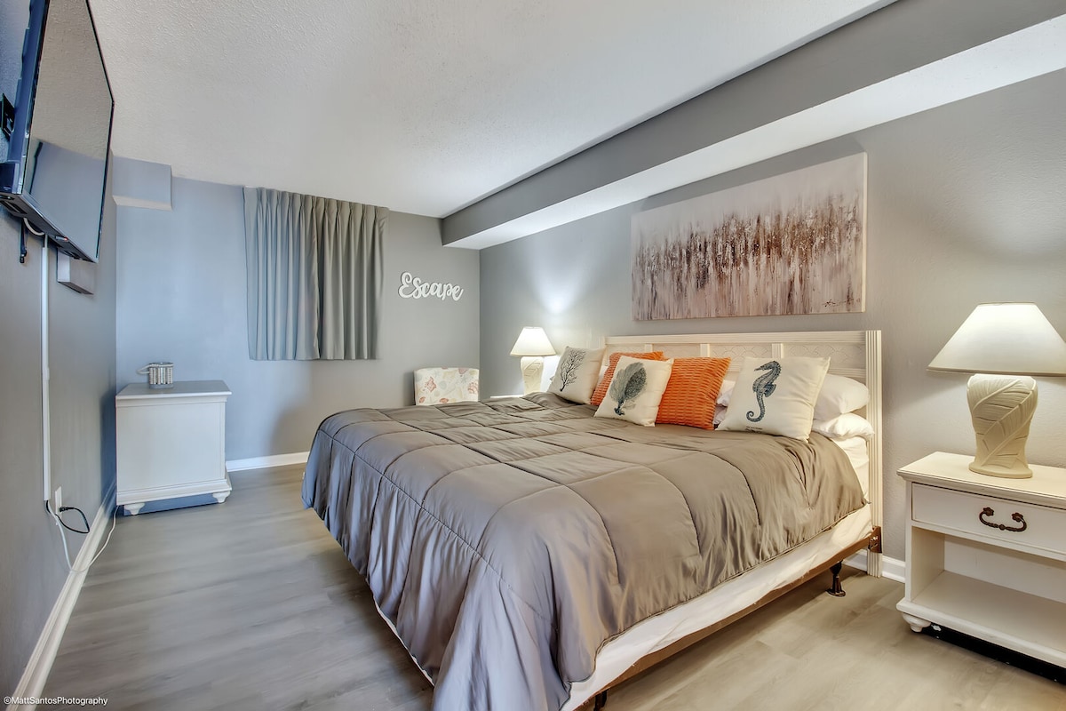 ¡RENOVADO FRENTE AL MAR! ¡Cocina COMPLETAMENTE NUEVA con encimeras de cuarzo! ¡Imagina tomar tu café de la mañana con ESTA vista! ¡Apartamento de 3 dormitorios y 3 BAÑOS COMPLETOS! Capacidad para 8 personas con 4 camas y 2 colchones de dos camas individuales. Una playa tranquila con atracciones a tu alcance. Desembarco descalzo con tiendas, restaurantes y entretenimiento musical a menos de 1 milla de distancia. Visita numerosos campos de golf, Broadway at the Beach, Tangier Outlets, Carolina Opry, Pirate 's Voyage, putt putt golf a pocos minutos.