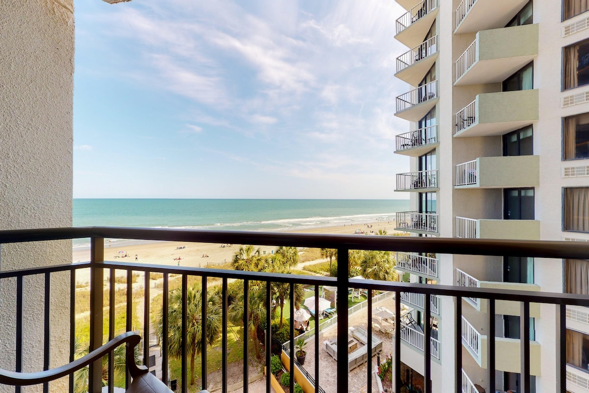 Discover your oceanfront retreat designed for couples or families with up to 6 guests who want resort amenities like pools and a lazy river, easy beach access, and a central location close to all that North Myrtle Beach has to offer! This beautiful 1-bed, 1-bath, 4th-floor oceanfront condo at Beach Cove Resort features a private balcony with views of the ocean and lush treeline.