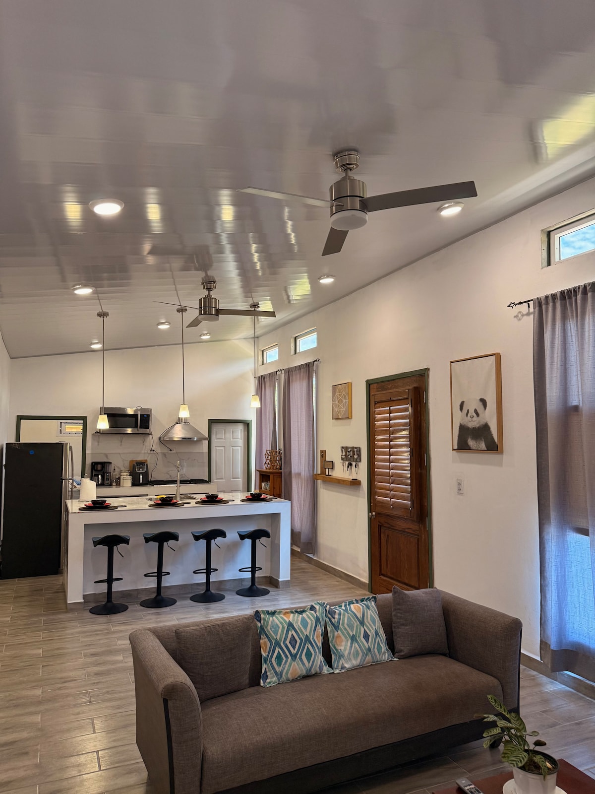 Villa Nova se encuentra en la planta baja que rodea la piscina. En la planta superior se encuentra la villa Luna doble. Esta villa fue construida con un propósito en mente; para ofrecer a nuestros huéspedes el mejor lugar para disfrutar de la playa en un hogar moderno y completo para disfrutar con la familia. Aire acondicionado en todas las áreas y ventiladores de pedest. La cocina está completamente equipada; una mesa grande para ocho personas y un sofá seccional. Todas estas son las mejores cualidades que te hacen sentir como en casa, tu hogar en la playa. Incluye el mantenimiento de la casa, una vez al día.