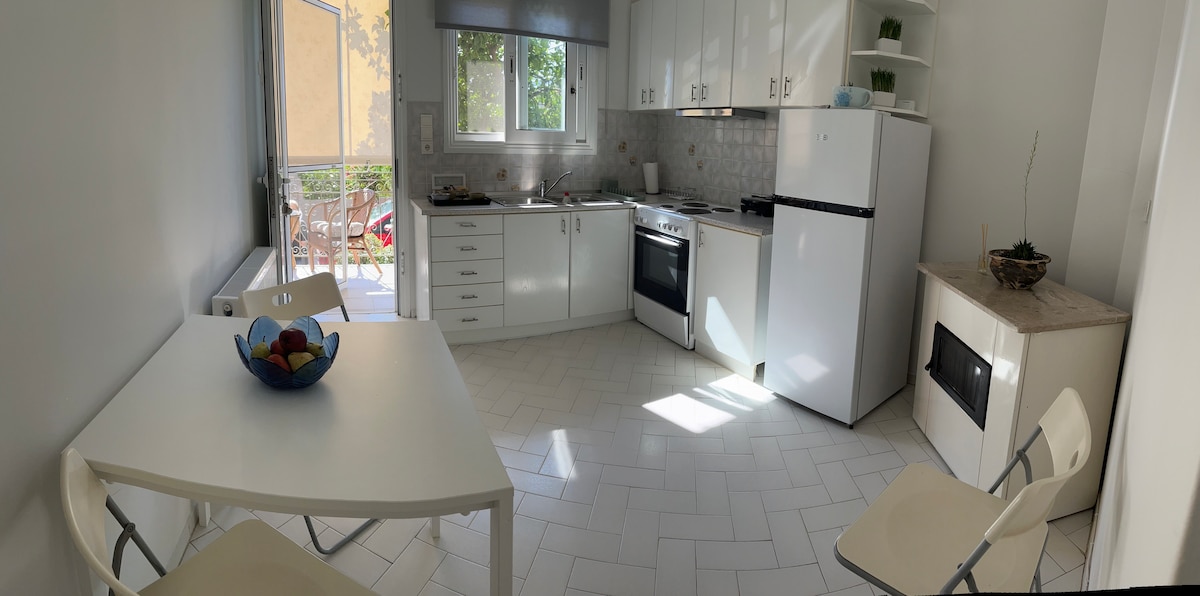 Lugar ideal para destinos de negocios.El estudio/apartamento está a sólo 10 minutos del aeropuerto de Atenas en un barrio tranquilo. Ambiente acogedor y hogareño basado en la cultura helénica con decoración de principios de los años 50. Este acogedor estudio tiene capacidad para 2 personas(cama tamaño king) y otra pareja de personas adultas (sofá/cama). ¡Usted puede disfrutar de nuestro tiempo encantador con un café griego tradicional afuera en nuestro jardín y pedirnos información sobre las bodegas locales!!