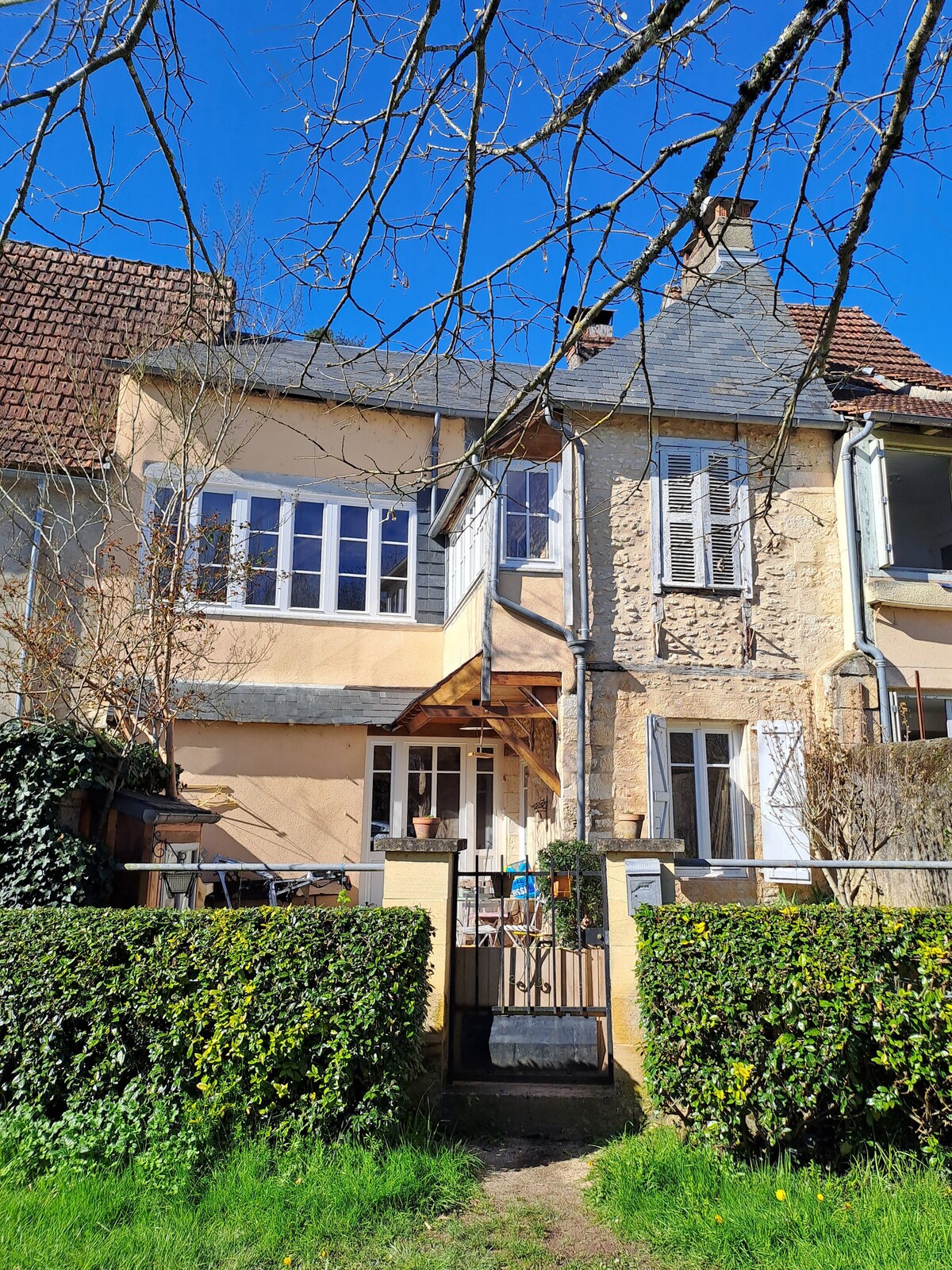 Hermosa casa rural con vigas y piedra a la vista recién reformada en noviembre de 2019. Aparcamiento y entrada al jardín del patio privado con terraza cubierta para comer y tu propio jacuzzi. Puertas francesas a la casa. La cocina está totalmente equipada, el salón tiene muebles muy cómodos y bonitas antigüedades francesas. El río Vézère está a solo 50 metros en nuestra propia tierra, excelente para practicar piragüismo, natación salvaje y hacer pícnics. A 2 minutos en coche de un impresionante pueblo medieval a 25 minutos del centro de Sarlat.