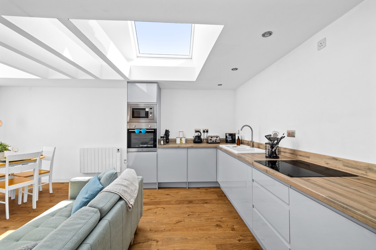 Una casa única y moderna con vistas completas al mar. Una propiedad espaciosa pero acogedora con un dormitorio en el nivel del entrepiso y un baño privado con las mejores vistas al mar para despertarse. La planta baja es un salón/cocina y comedor de planta abierta con calefacción por suelo radiante y estufa de leña. La propiedad también tiene un lavadero con lavadora y polea y un aseo/ducha en la planta baja. 1 plaza de aparcamiento privado disponible en el sitio.