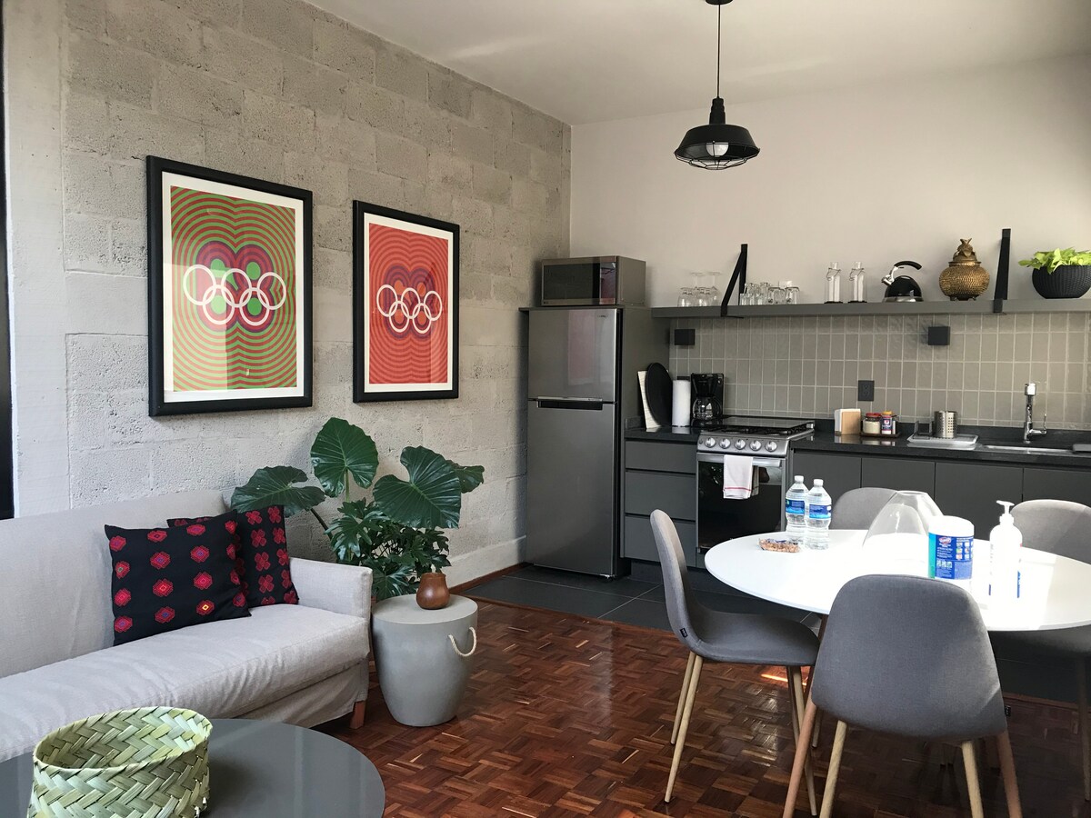 We are inside of a just renovated building from the 50s located in the heart of hip neighborhood "LA CONDESA" Walking distance from Parque México, and lots of coffees and shops. Sevi and Martina will be happy to show you the neighborhood and be your hosts. This apartment is all newlly fresh decorated all hand made by us, super cozy, with lovely living room with fresh vibes, kitchen and super nice king size spacious bedroom.