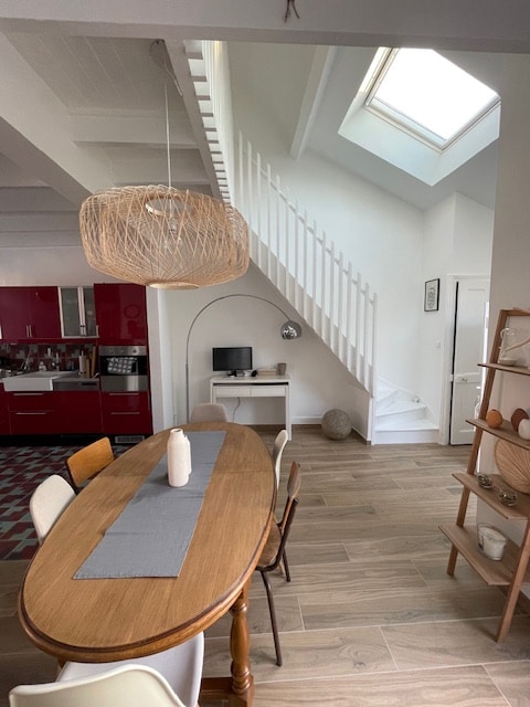 Relájese en este loft abuhardillado amueblado sobre nuestra casa con acceso independiente, a 200 m de la playa. El alojamiento incluye: - una sala de estar: cocina, sala de estar, sofá cama, cama de 90 cm - Una habitación con cama de 140 cm, armario y cómoda, televisión (cuna bajo petición) - Un cuarto de baño con una bañera-ducha, inodoro - Una terraza de 20 m² amueblada Un verdadero nido donde todo está previsto para que tenga una estancia agradable.