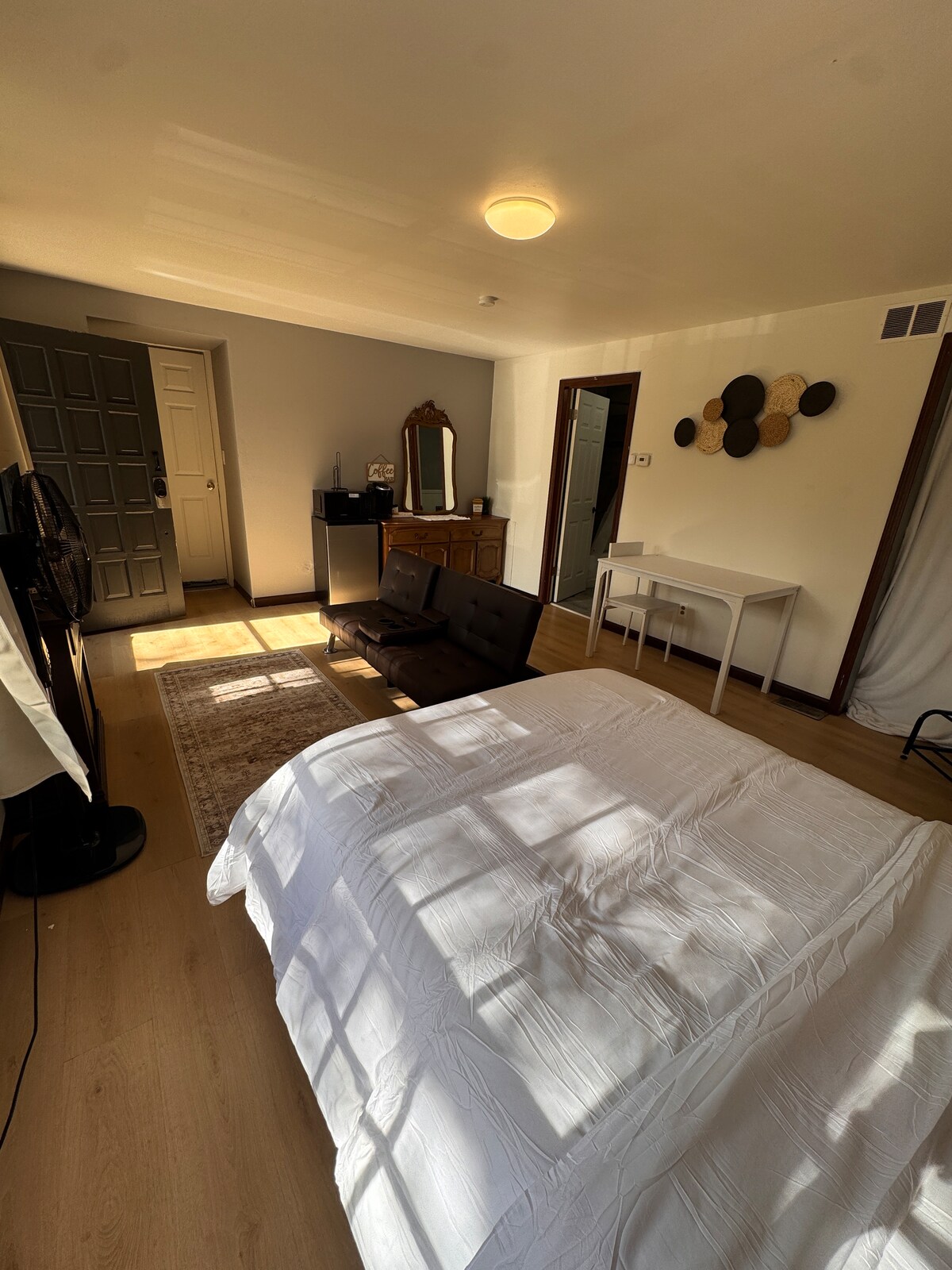 Casa unifamiliar NE, tranquilo y seguro callejón sin salida, 3rd Lawrence Ct. N. de 13th, con estacionamiento fuera de la calle. Entrada privada bien iluminada a los cuartos separados con dormitorio grande, cómoda, mesa auxiliar, cama tamaño king californiano. Sala de estar con sofá y sillón de dos plazas y TV inteligente de 50 pulgadas, cocina totalmente equipada. Barrio limpio con policía y bombero. Una gran terraza para observar aves cantoras con vistas al estanque con cascada, flores cerradas en una valla de privacidad de madera de 10' para relajarse. Cerca de la Universidad Estatal de Wichita.
