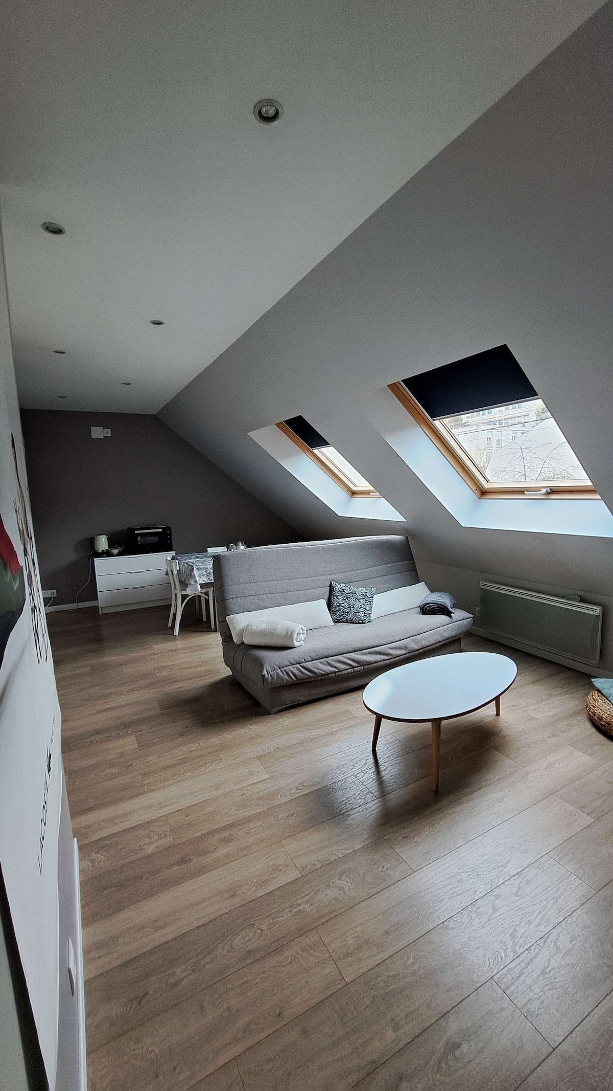 Se trata de un gran estudio que incluye en la misma habitación una cama doble grande (160 de ancho), un sofá cama (140 de ancho) y un banco para 1 persona (90 cm de ancho). El alojamiento está situado a menos de 5 minutos a pie del centro con todas las tiendas y a 12 minutos a pie de la estación de tren. Está en el primer piso en una casa situada en un gran patio cerrado por un gran portal. Frente a esta casa en el patio hay otra casa ocupada por nuestra familia.