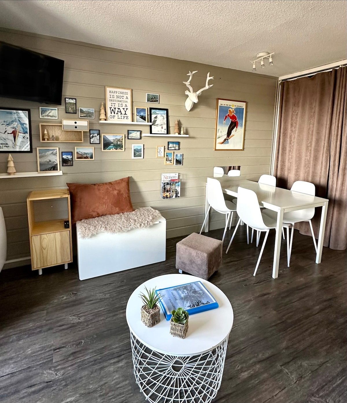 Alpe d'Huez, barrio de Viel Alpe, en pleno centro. Encantador apartamento con una vista impresionante en el cuarto piso con ascensor. Acceso inmediato a las pistas de ida y vuelta. Cuenta con 1 dormitorio con una litera y una cama nido (3 camas), 1 entrepiso (atención baja altura - ver fotos) con 2 colchones dobles en el suelo, y 1 sofá cama en la sala de estar. Es ideal para hacer todo a pie durante su estadía. La limpieza debe hacerse al salir por el bien de todos.