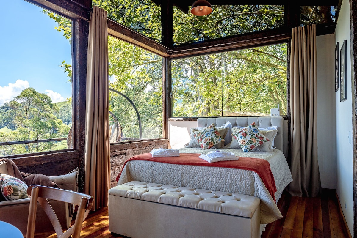 Descubre el encanto de Serra da Mantiqueira en esta cabaña diseñada para que puedas contemplar el amanecer sin levantarte de la cama. Ven a relajarte en nuestro spa climatizado, contemplando las estrellas en el techo y la red de columpios. La cabaña tiene una habitación integrada con una acogedora cama tamaño queen. En la sala de estar/cocina, un futón súper cómodo tiene capacidad para dos huéspedes más, lo que hace que la experiencia sea ideal para familias. La propiedad también tiene senderos y pequeñas cascadas.