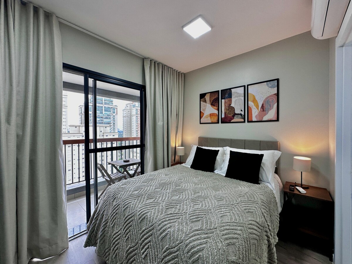 Estudio nuevo, muy bien decorado y equipado, con todas las comodidades necesarias para su estancia. Totalmente automatizado, cómodo, acogedor. El edificio es moderno con una excelente infraestructura de ocio: piscina, gimnasio, salón de fiestas con bar, coworking, lavandería y bicicletero. Tiene vista verde a la plaza, la calle es tranquila y de fácil acceso. Está ubicado entre los barrios de Moema, Brooklin y Vila Olimpia, a 5 minutos del Shopping Ibirapuera ya 15 del Aeropuerto de Congonhas.