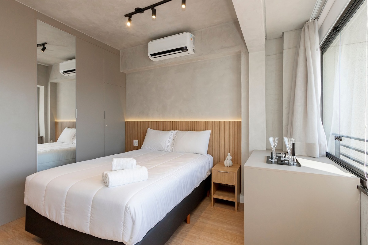 Estudio nuevo, muy bien decorado y equipado, con todas las comodidades necesarias para su estancia. Totalmente automatizado, cómodo, acogedor. El edificio es moderno con una excelente infraestructura de ocio: piscina, gimnasio, salón de fiestas con bar, coworking, lavandería y bicicletero. Tiene vista verde a la plaza, la calle es tranquila y de fácil acceso. Está ubicado entre los barrios de Moema, Brooklin y Vila Olimpia, a 5 minutos del Shopping Ibirapuera ya 15 del Aeropuerto de Congonhas.