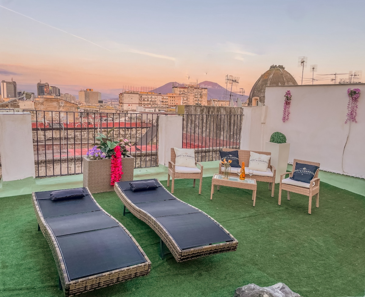Apartamento de lujo: una combinación de elegancia clásica y modernidad, recién renovado con JACUZZI y TERRAZA PRIVADA de 90 m² donde se puede admirar el volcán Vesubio. Ubicado en un edificio histórico en el tercer piso sin ascensor en el corazón del casco antiguo, puedes llegar a todo caminando. Wifi, PrimeVideo, Nespresso y almacenamiento de equipaje GRATIS Sitios de interés - Duomo a 2 minutos. • 4 minutos de Nápoles subterráneo. • Metro L1 y L2 de 6 minutos • Estación de tren a 5 minutos. • A 10 minutos del puerto.