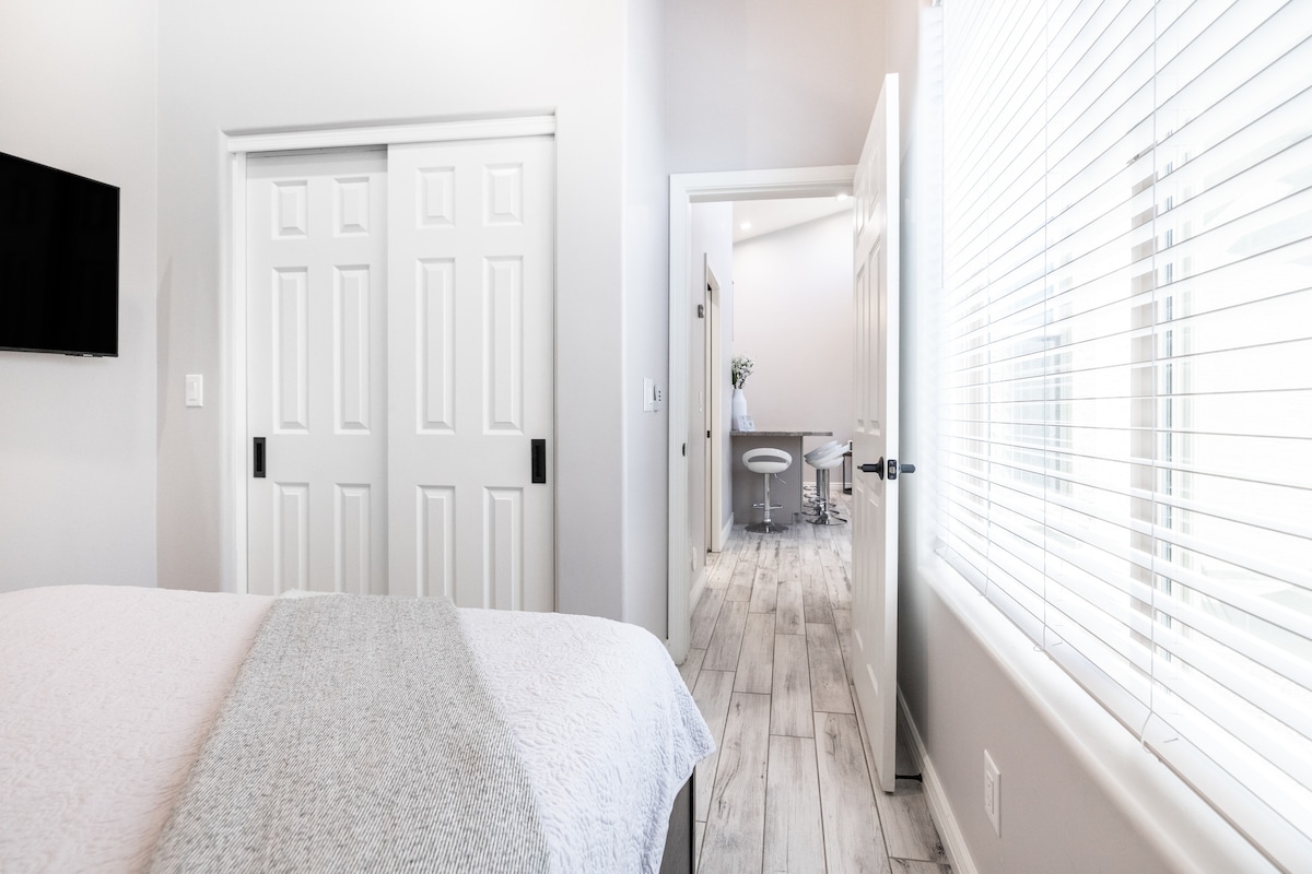 Unidad privada grande de 3 dormitorios de nueva construcción con cocina moderna que incluye nevera de acero inoxidable, estufa, microondas, lavavajillas, mesa de comedor para seis, isla de cocina con capacidad para 4 personas, baño principal grande con vestidor y lavabo doble grande. Los 3 dormitorios tienen dos camas tamaño queen y dos camas individuales. Hay un televisor Samsung de 75 pulgadas en la sala de estar y uno de 55 pulgadas en el dormitorio principal. También tiene una nueva lavadora y secadora grandes. El garaje se puede compartir con la unidad adjunta separada de 1 dormitorio.