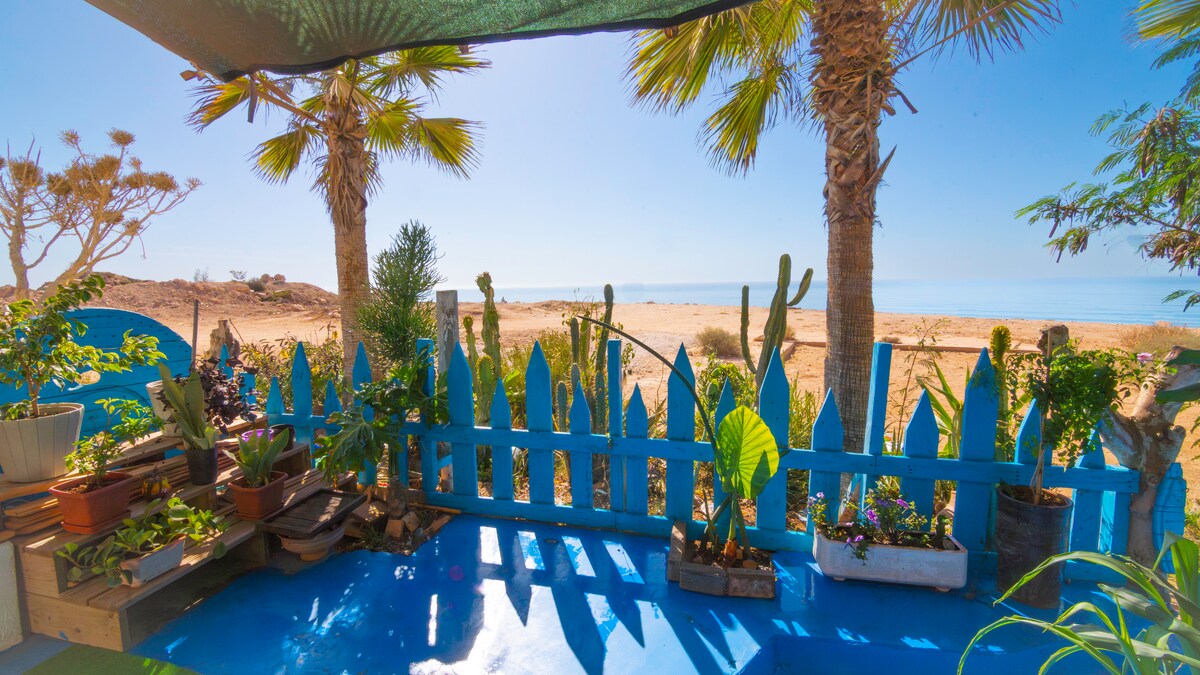 Ubicada en el vibrante y colorido pueblo de Aghroud, Rosyplage es una joya frente a la playa que ofrece impresionantes vistas al mar desde cada habitación. Planta baja: estudio totalmente equipado. El primer piso se siente como estar en un barco con un salón marroquí y un televisor listo para Netflix de 75 pulgadas. Dos dormitorios orientados al mar te esperan arriba. Nivel superior: cocina que conduce a una terraza, seguida de un solárium bañado por el sol ideal para hacer yoga y puestas de sol. Las comodidades modernas se encuentran con el encanto de la costa. Nota: la casa tiene 4 niveles y muchas escaleras no son adecuadas para niños pequeños.
