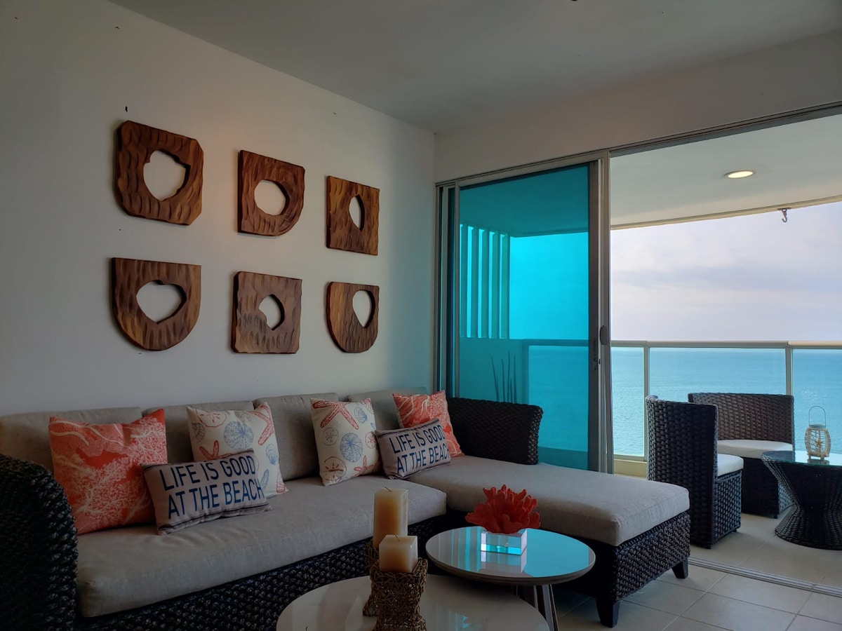 Frente al mar con seguridad 24h en la urbanización, playa y parqueo. Acorde con el sonido del mar, tome café con la brisa entrando por la ventana y sienta que el tiempo paró ♥ ⭐Incluye: • 3m caminando a playa • Parqueo y vistas 360° • WiFi 600Mb • Piscinas, jacuzzi y zona BBQ • Cuartos con A/C, agua caliente y cortinas • TV: Netflix, Spotify & Alexa • Airfryer, cafetera, micro, refri y cocina • 3 baños, cuna, Petfriendly, ascensor • Toallas, ropa de cama y papel • Guardias, y cámaras 24h