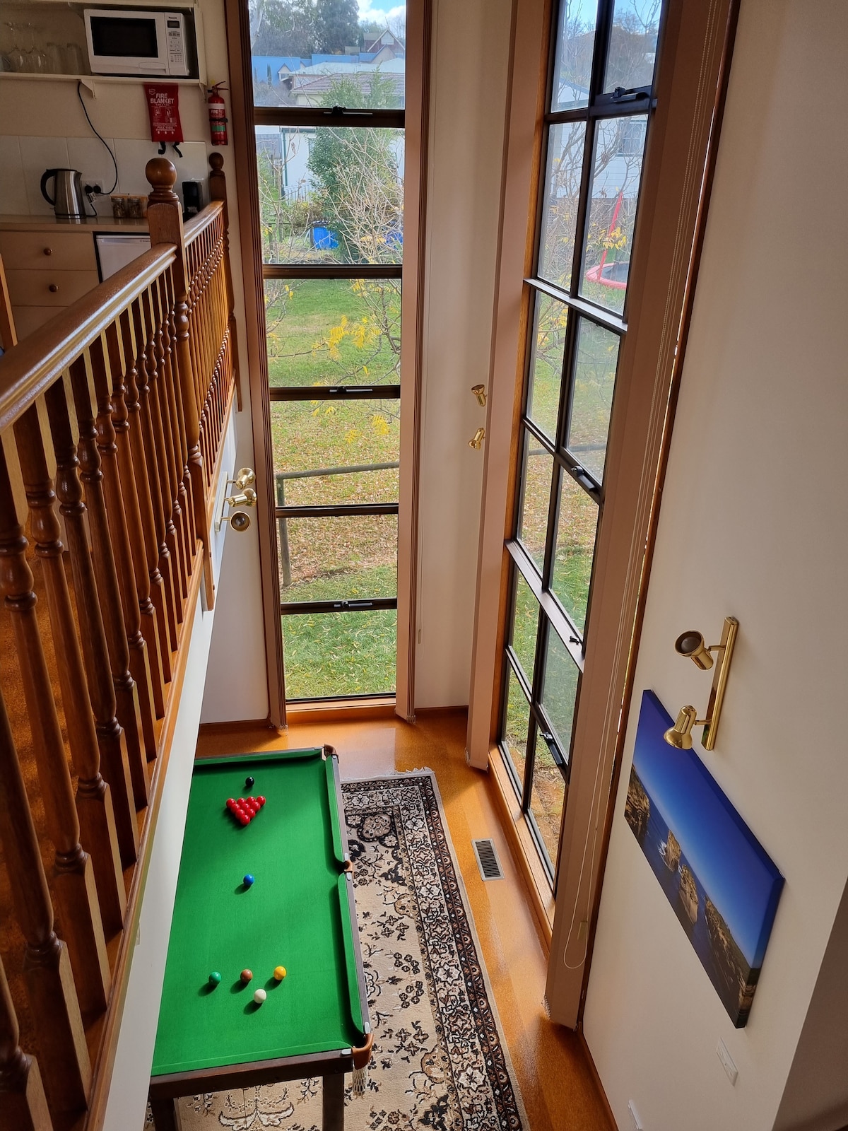 This is a comfortable self-contained studio, formerly an actual artist's studio, underneath the main residence, with its own shower and toilet, as well as a kitchenette. It has a queen bed, a king single that doubles as a sofa, and a single trundle bed. It has a small dining table and four chairs. It now boasts a camping washing machine for light loads, and an airer, as well as a dehumidifier. I also added an air fryer!