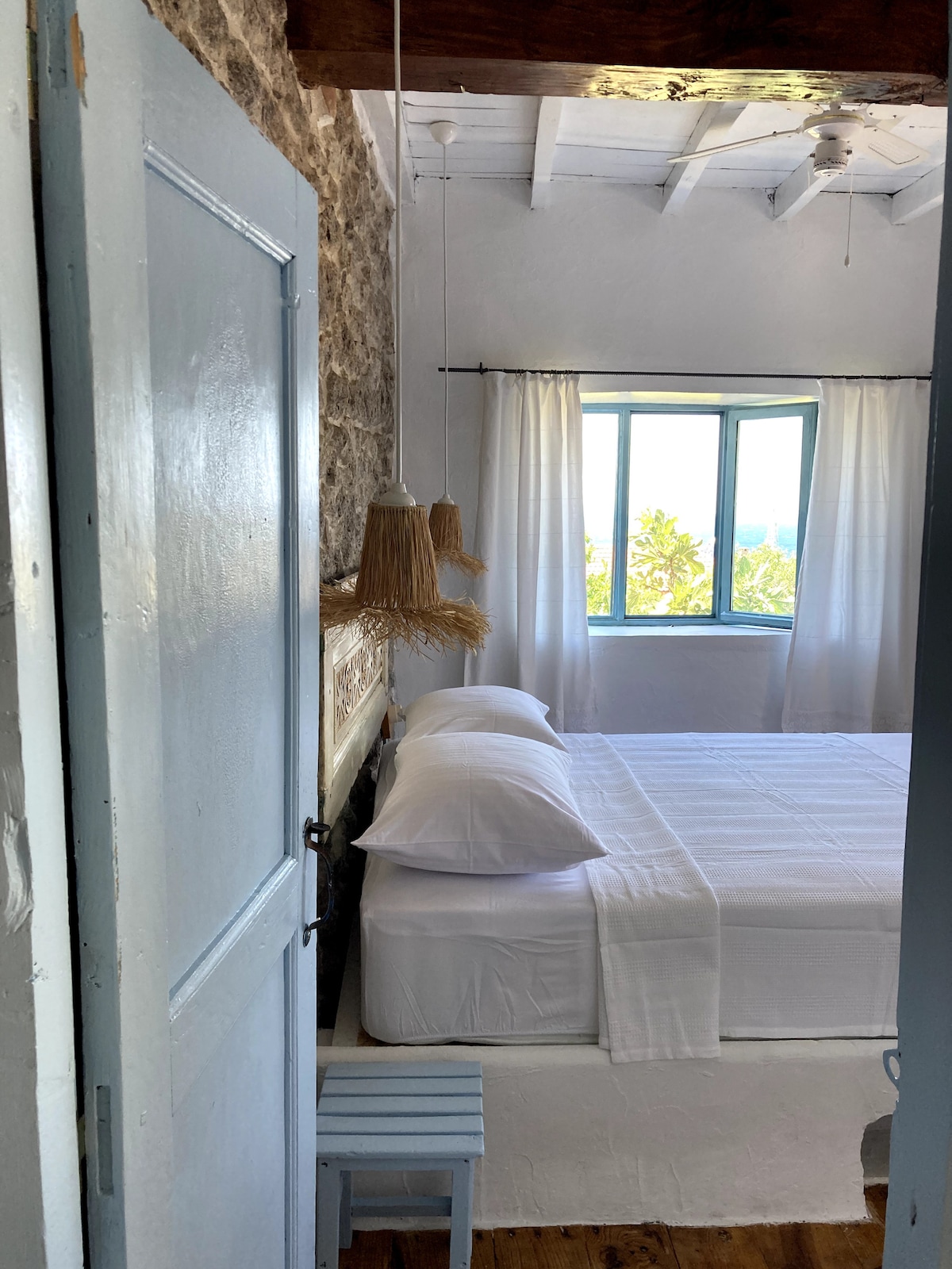 Nuestra casa de piedra con ventanal, una superficie interior de 55 m2, más de 100 m2 con su propio jardín y un aparcamiento común adicional y huerto de frutas y verduras, está diseñada para que dos personas o familias pequeñas se alojen cómodamente. Podrás disfrutar de la vista al mar Egeo desde casi todas partes de nuestra casa durante todo el día; podrás disfrutar de la cena con la exquisita vista bajo los árboles con la ensalada y barbacoa que has preparado con las verduras que recoges del huerto en nuestra cocina al aire libre.