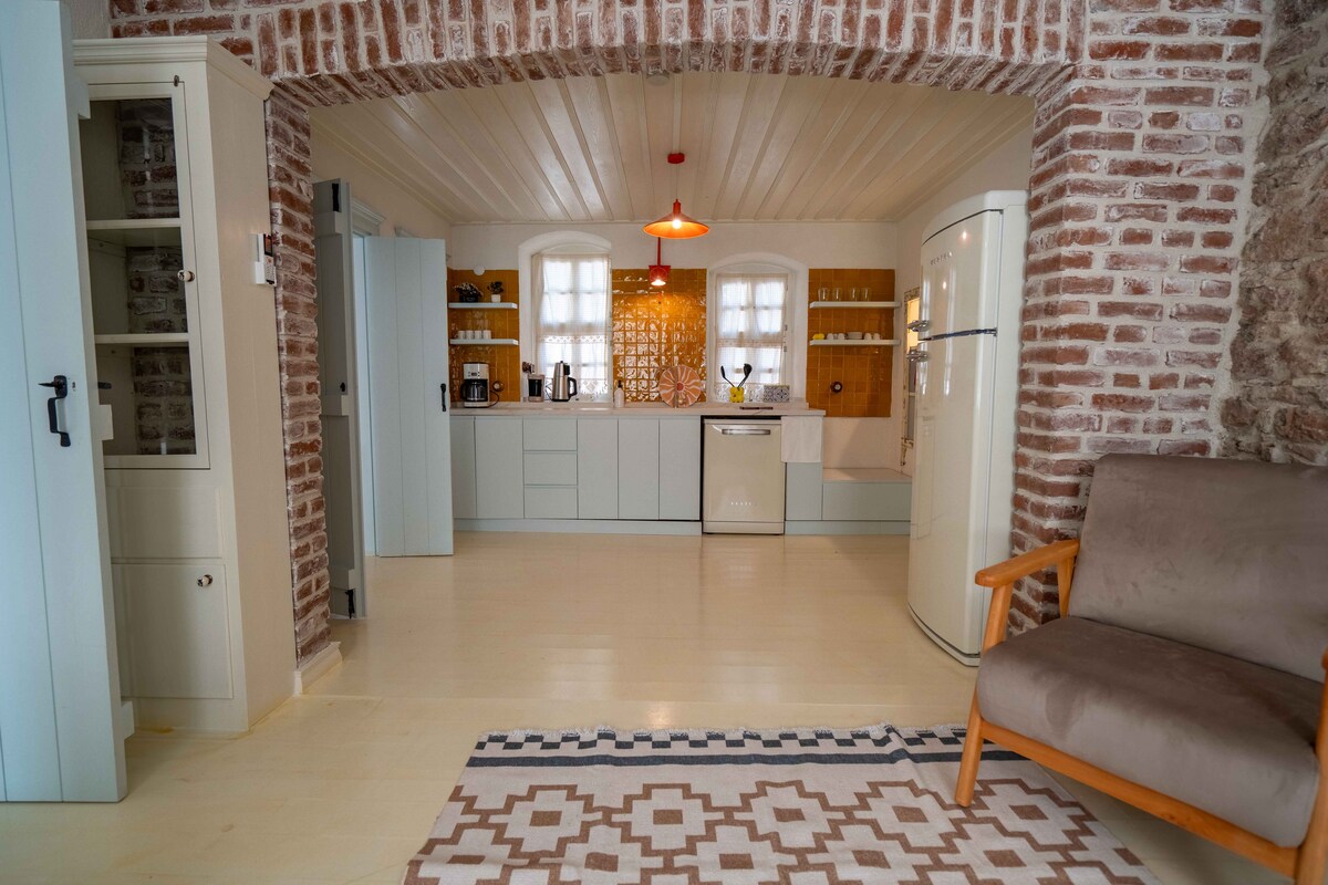 La casa, que ofrece a sus huéspedes diferentes experiencias en alojamiento y ha sido recientemente restaurada, le dará la tranquilidad y hará que sus vacaciones sean inolvidables con su decoración original. El entresuelo es un baño encantador y la planta baja es una sala de estar. La isla de la cocina abierta se convierte en una mesa cuando se solicita. La calle, como la casa, se convierte en una vista cuando se abre la puerta. La casa se ha restaurado sin interrupciones, es posible que aquellos que buscan una higiene excesiva no estén satisfechos.