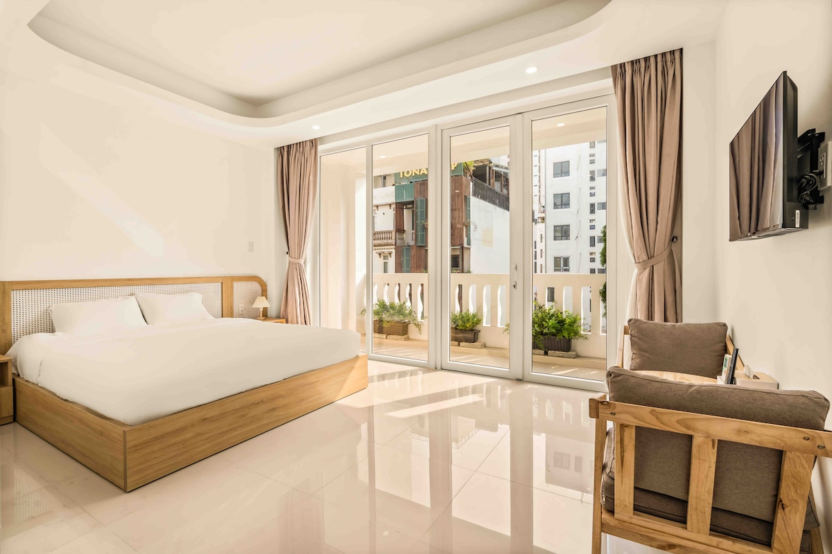 Experimenta Da Nang desde arriba en este luminoso y elegante estudio del cuarto piso. Disfruta de amplias vistas a la ciudad desde tu balcón privado y de mucha luz natural desde grandes ventanas. El espacio se siente abierto y tranquilo, combinando un diseño minimalista con una comodidad acogedora. Una espaciosa estación de trabajo con una cómoda silla se encuentra junto a la ventana, lo que te brinda un lugar tranquilo e inspirador para leer, trabajar o simplemente disfrutar de la brisa. Perfecto para viajeros que buscan una vida tranquila y moderna cerca de la energía de la ciudad.